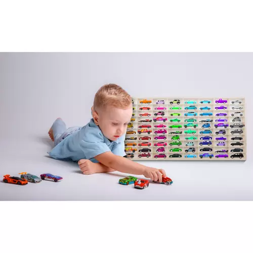 Покажете колекцията колички така, че винаги да е пред очите и едновременно перфектно подредена. Полицата от качествен дървен шперплат има 80 практични отделения, така че всеки модел ще има своето място и децата лесно ще намират любимата количка без дълго търсене.