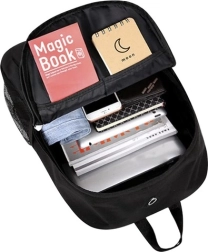 Елегантна черна раница от издръжлива Oxford тъкан е водоустойчива, а благодарение на подплатения гръб и раменни презрамки с MESH мрежа се носи комфортно през целия ден. Светещият рефлексен печат повишава видимостта ви по здрач и в тъмното, което я прави отличен избор за ученици, за града и за излети.