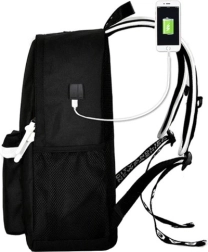 Модерното оборудване включва вграден USB порт за лесно зареждане от външна батерия и изход за слушалки 3,5 мм. Основното отделение с двойни ципове побира книги, лаптоп или тетрадки, а вътре ще намерите няколко джоба за дребни вещи. В комплекта получавате още пенал, удължителни кабели USB и 3,5 мм и кодова ключалка за по-голямо спокойствие при пътуване.