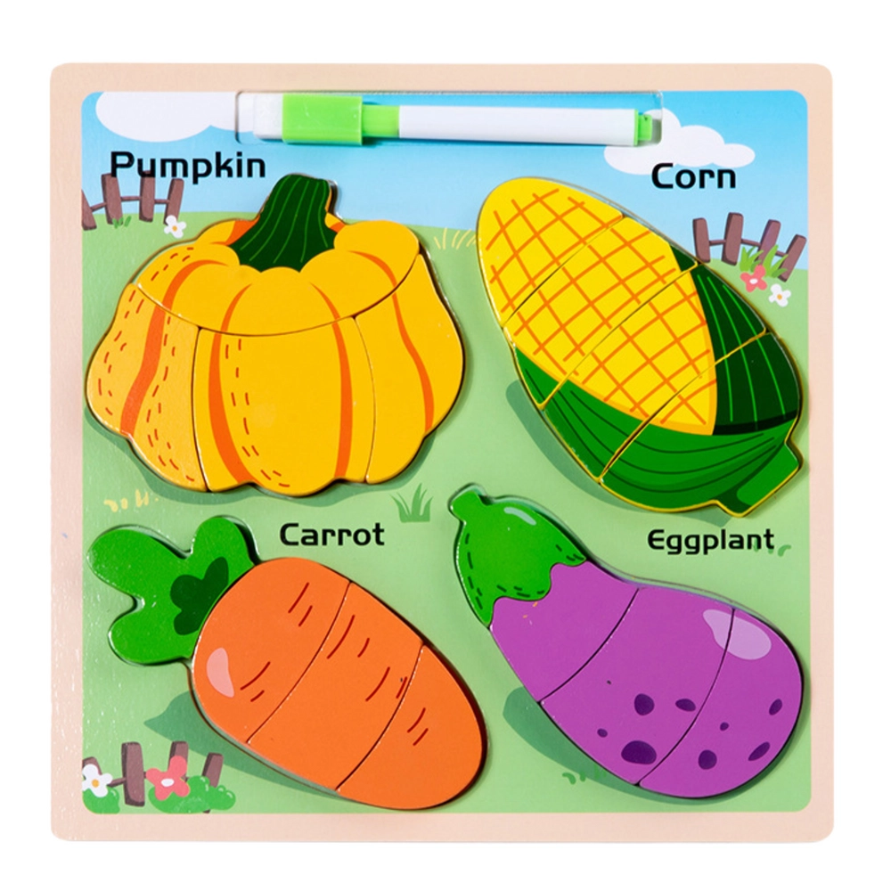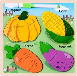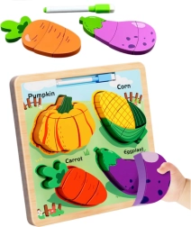 Този дървен пъзел дава на децата чудесна възможност да се запознаят с формите и да упражняват фината моторика. Включва четири популярни вида зеленчуци: тиква, царевица, морков и патладжан. Всеки елемент е разделен на по-малки части, които децата подреждат в съответните места на плоскостта.