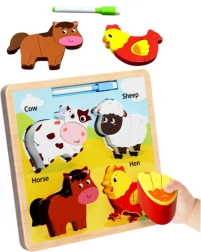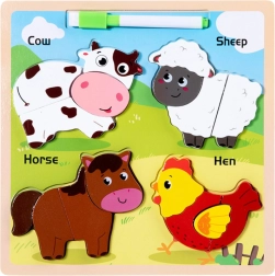 Този дървен образователен пъзел включва животни като крава, овца, кон и кокошка, познати на децата. Всяко животно се състои от няколко части, които трябва да се подредят на правилното място, което подпомага развитието на координацията и логическото мислене.