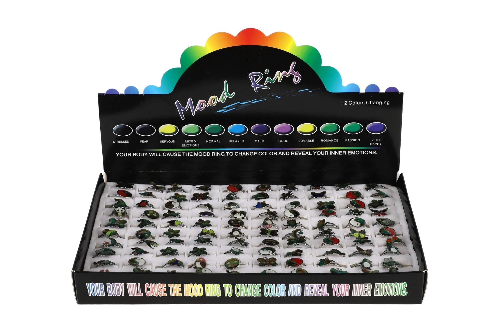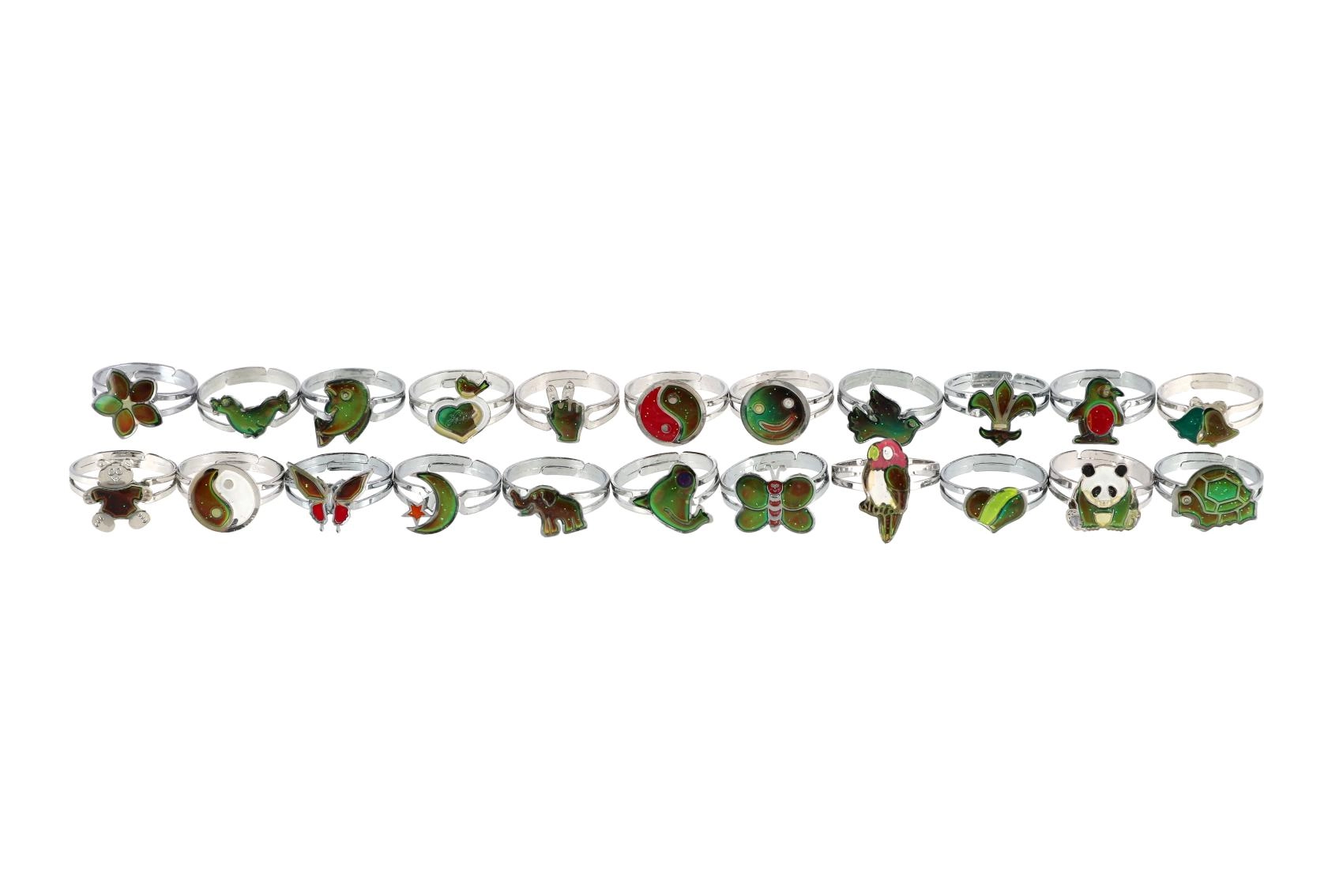 Тези стилни пръстени съчетават игривост с прост физичен принцип. Термоактивният слой мигновено реагира на промените в температурата на тялото и създава впечатляващи цветови ефекти, които децата обожават. Всеки пръстен има регулируема метална лента, така че лесно се адаптира към повечето пръсти.