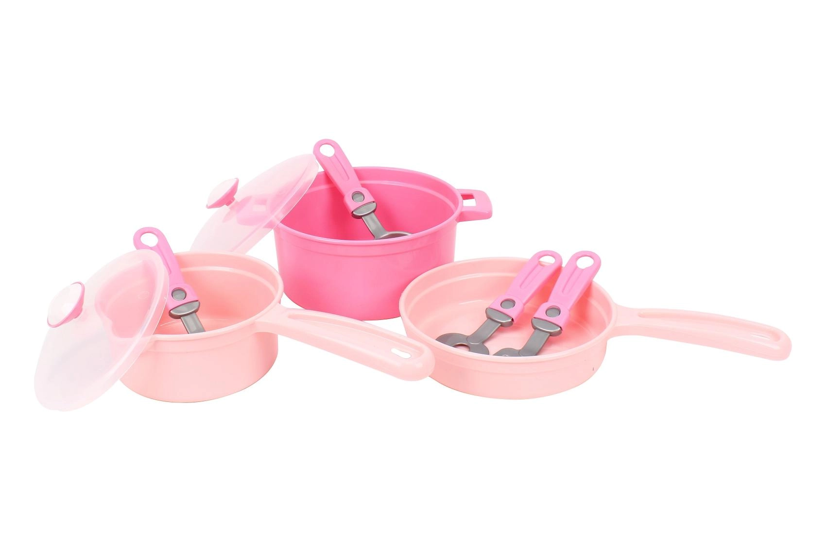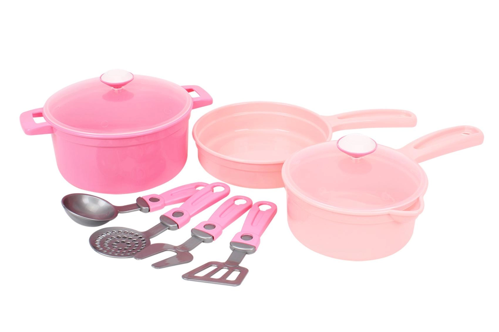 Този розов детски комплект съдове за кухничка е перфектно допълнение към всеки детски кът. Благодарение на леката и издръжлива пластмаса с него се работи лесно и децата могат безопасно да имитират готвенето на възрастните. Прозрачните капаци и удобните дръжки подпомагат реалистичната игра и самостоятелността.