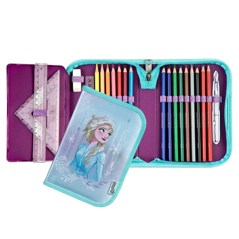 Ученическият несесер Frozen от Undercover предлага дизайн от популярния филм Замръзналото кралство, който ще харесат както по-малките, така и по-големите деца. Изработен е от издръжлив полиестер, което гарантира дълъг живот и защита на съдържанието. С размери 14 x 20 x 3 cm предлага достатъчно място за пълен комплект учебни принадлежности, включително 14 цветни молива, моливи, линия и други принадлежности.
