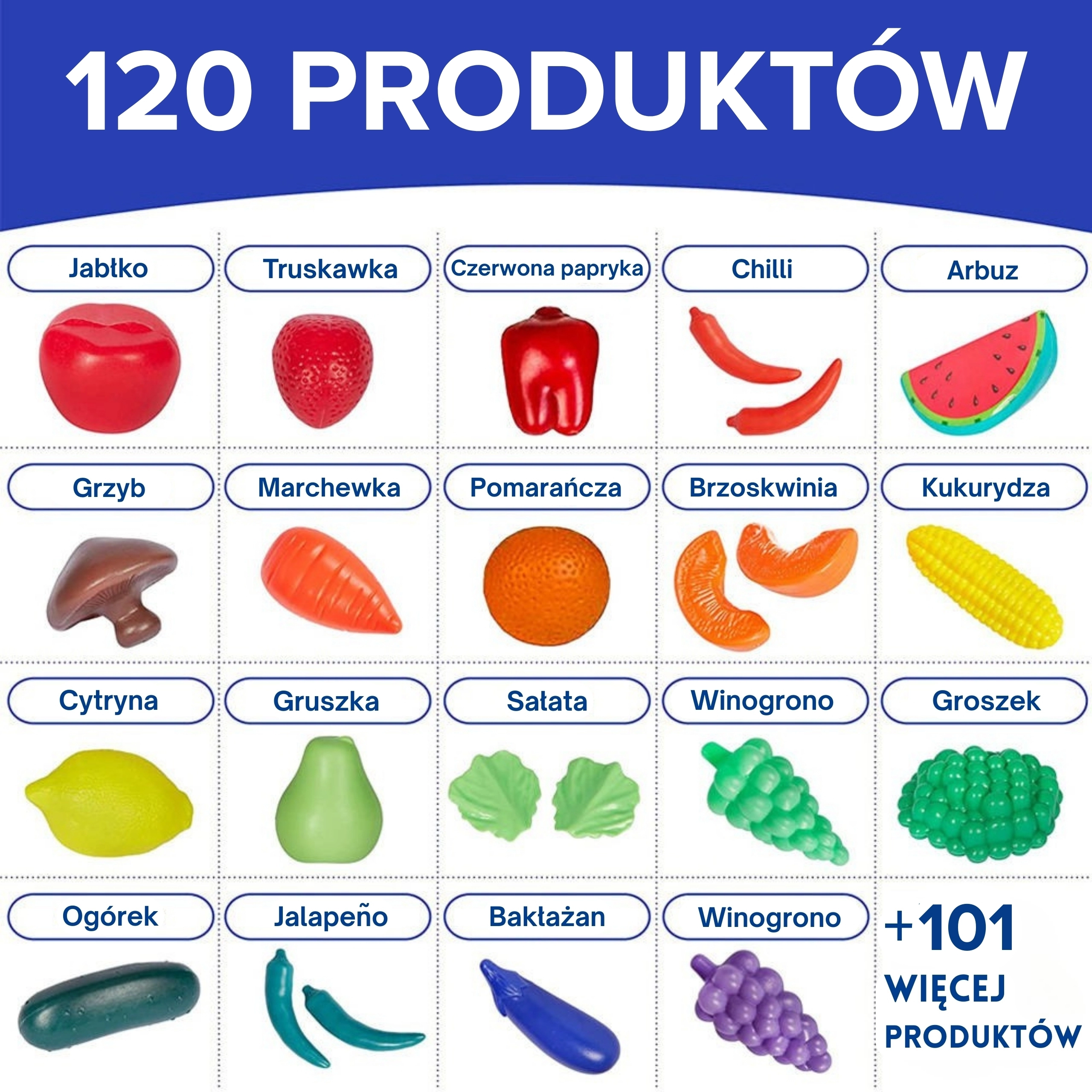 Комплектът включва: 120 разнообразни елемента, включително плодове, зеленчуци, печива, закуски, напитки и опаковки.