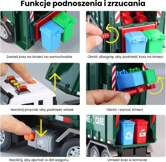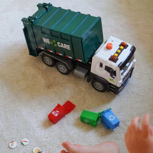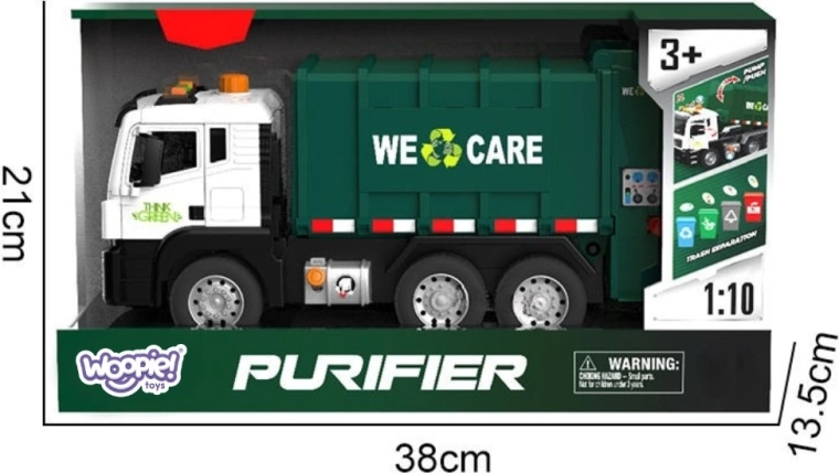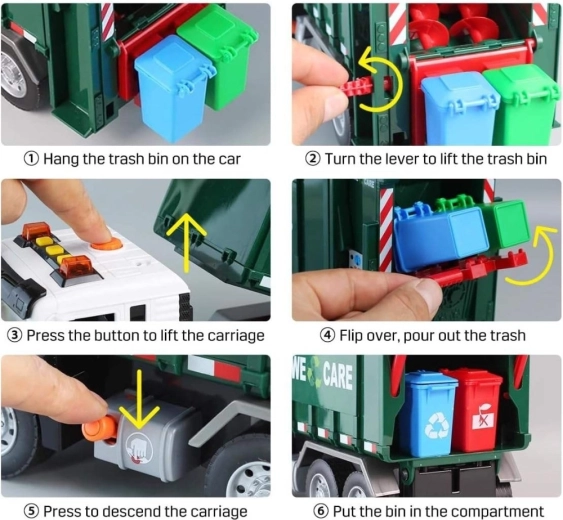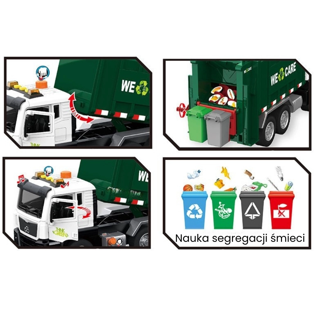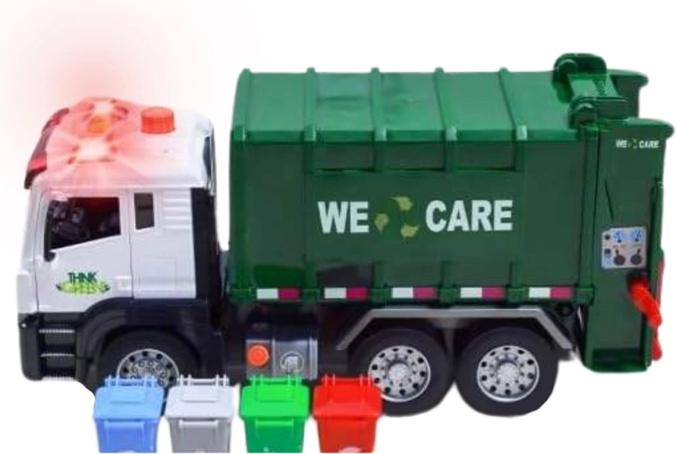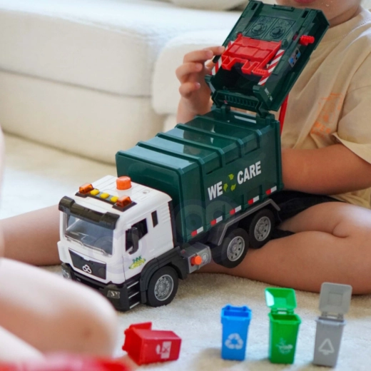 Камионът е оборудван със светлини и звуци за още по-голямо ангажиране. В кутията ще намерите 4 цветни кофи и комплект картончета с отпадъци, които помагат на децата да разберат кое къде се изхвърля. Подходящ за ежедневна игра у дома и в детската градина.