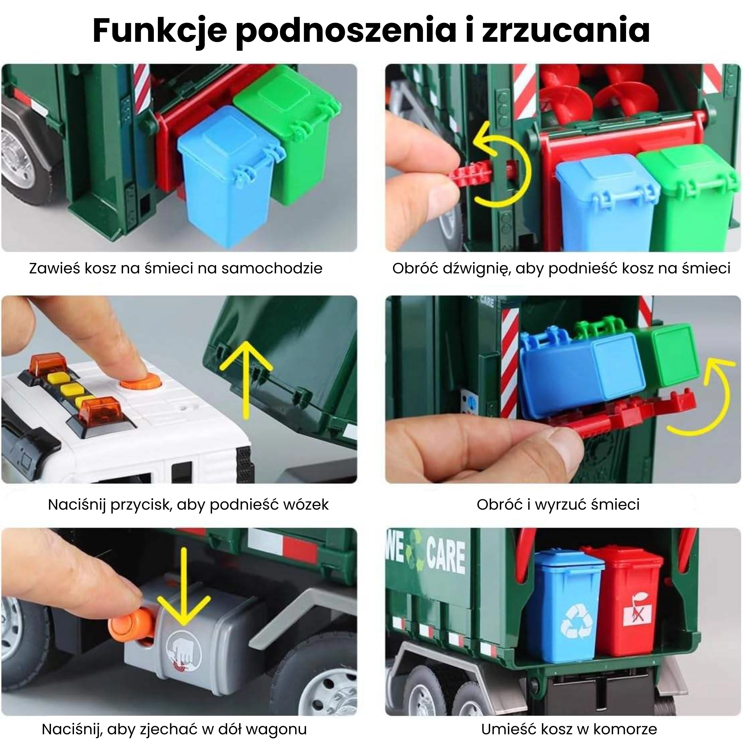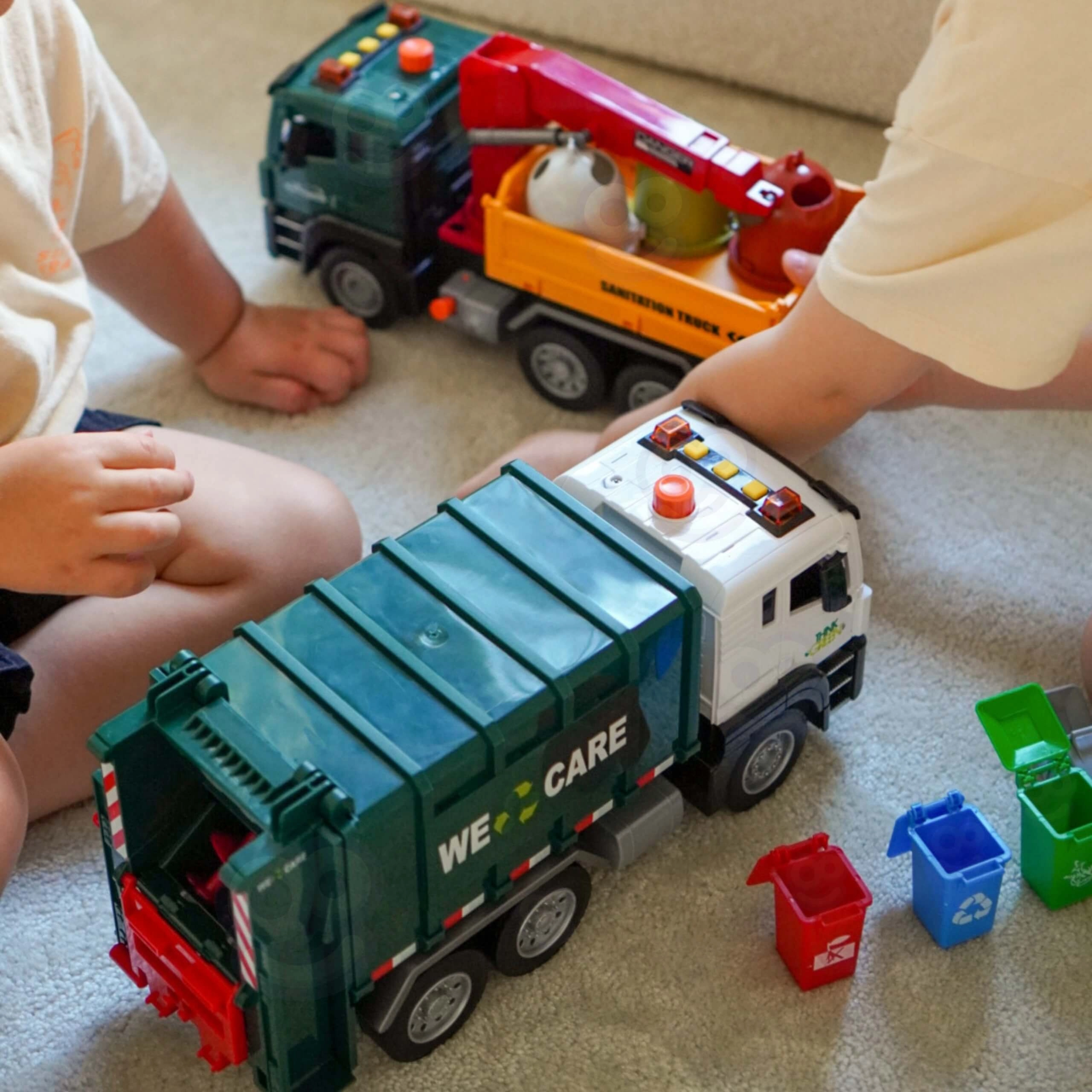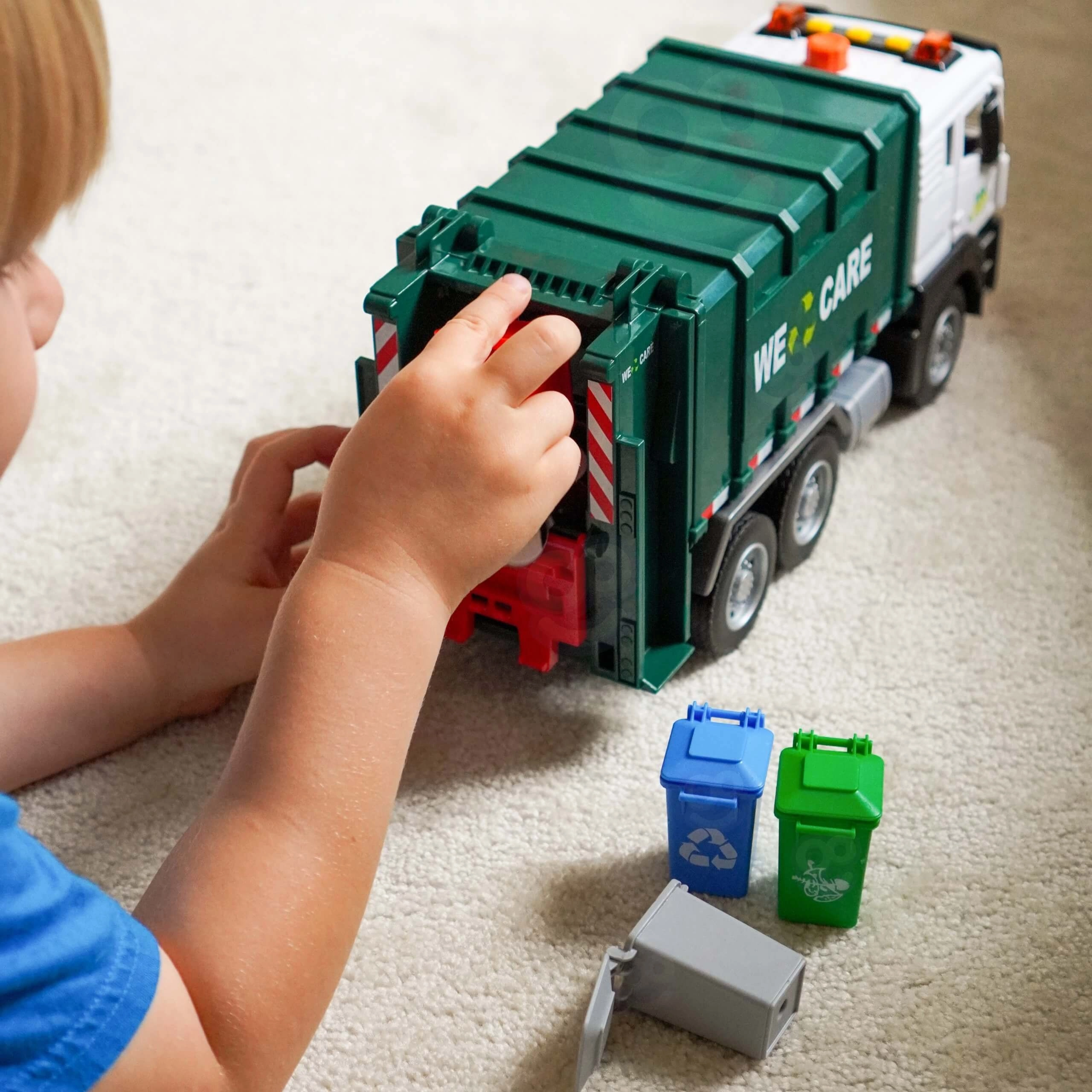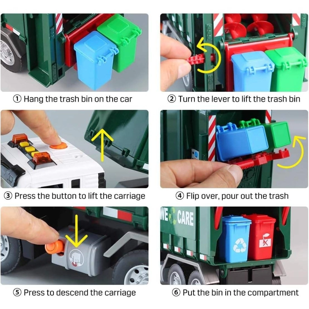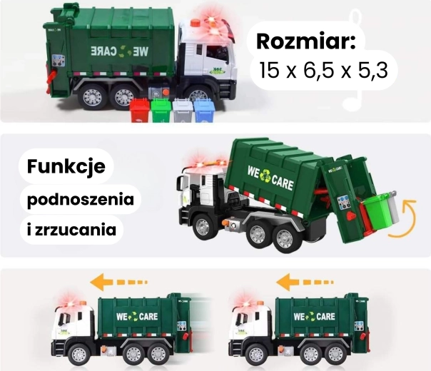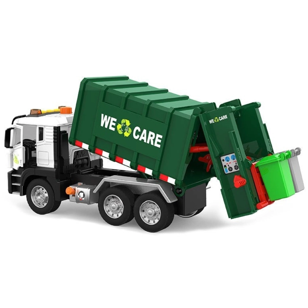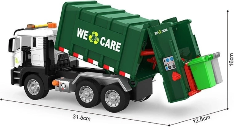 Този детайлно изработен боклукчийски камион с надпис „We Care“ носи на децата автентично преживяване от градския трафик. Функционалното рамо за повдигане на кофите, отваряемото задно товарно отделение и здравата конструкция подпомагат реалистичната игра и усвояването на екологични навици.