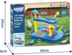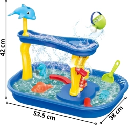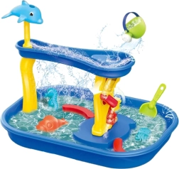 Водна играчка 2 в 1 с водно колело и водна пързалка – идеална за лятото! Създайте уникална зона за игра на децата в градината или у дома. Игривата, цветна масичка комбинира забавно „риболов“, пускане на вода и наблюдаване на нейния поток през конструкции като водно колело или пързалка с делфин.