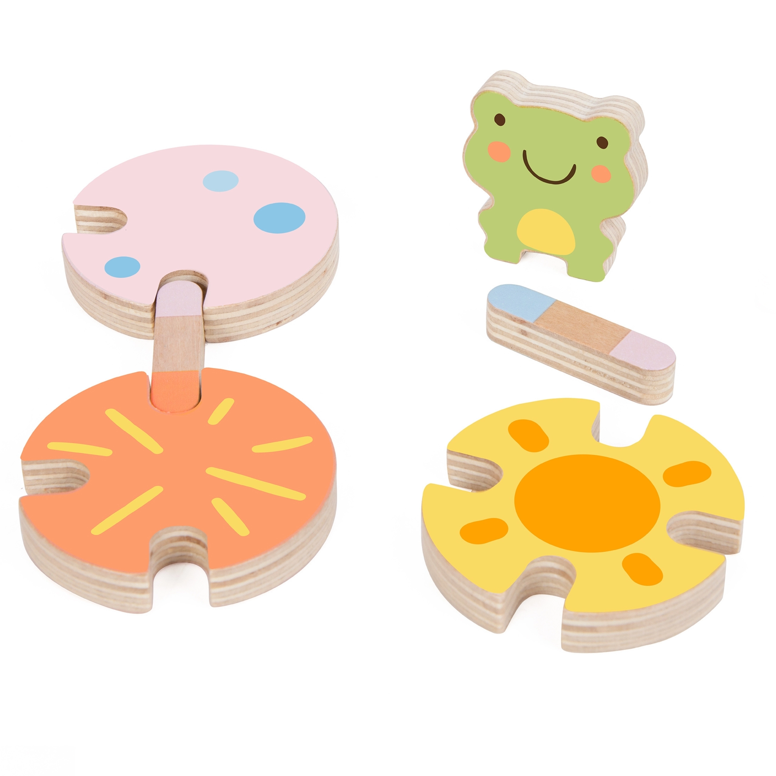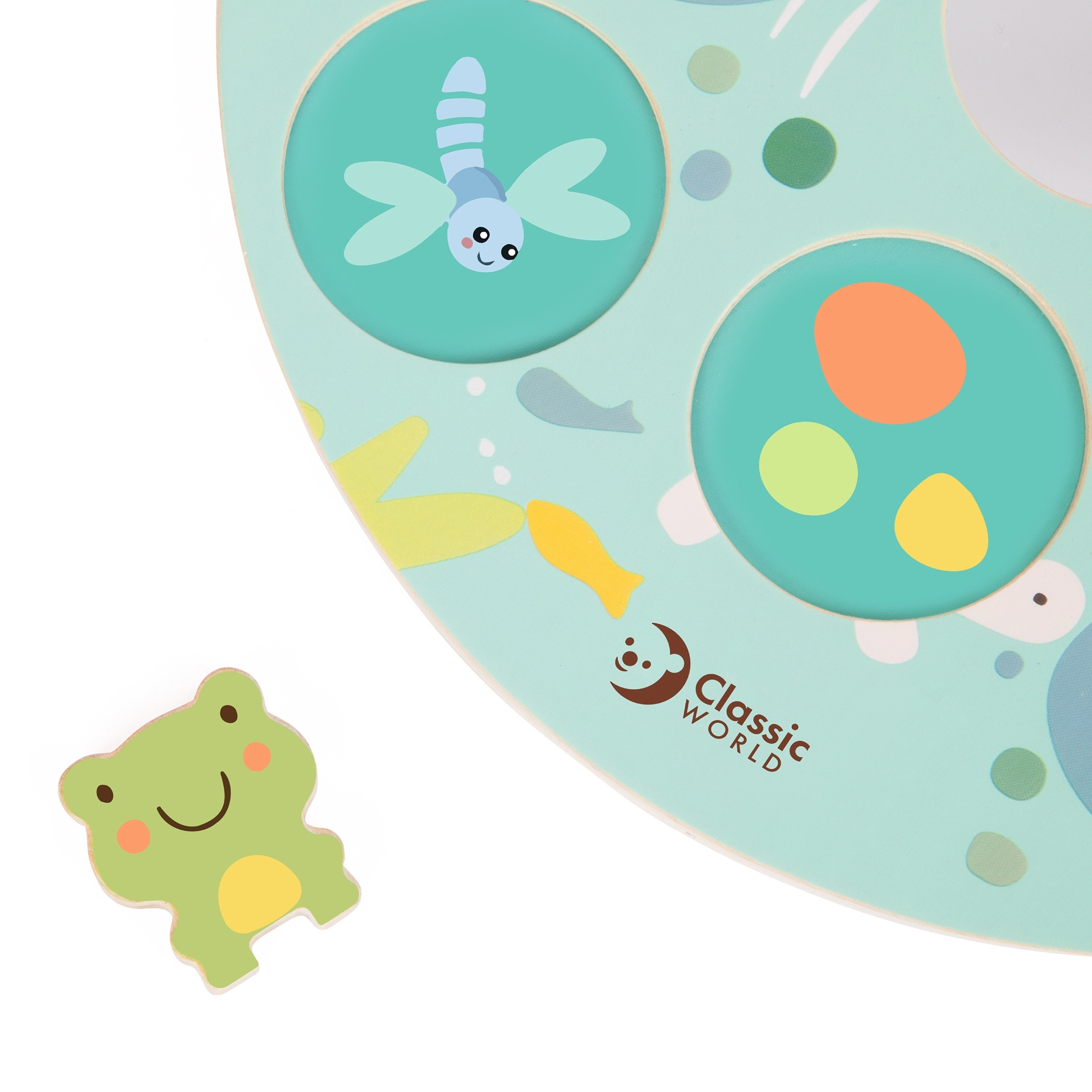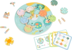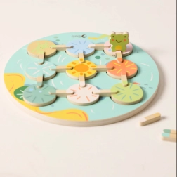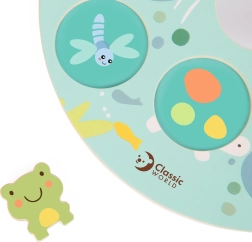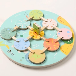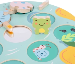 Пъстрата дървена жабка и нежните пастелни оттенъци придават естетическа стойност на играта и подпомагат разпознаването на цветовете.