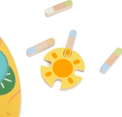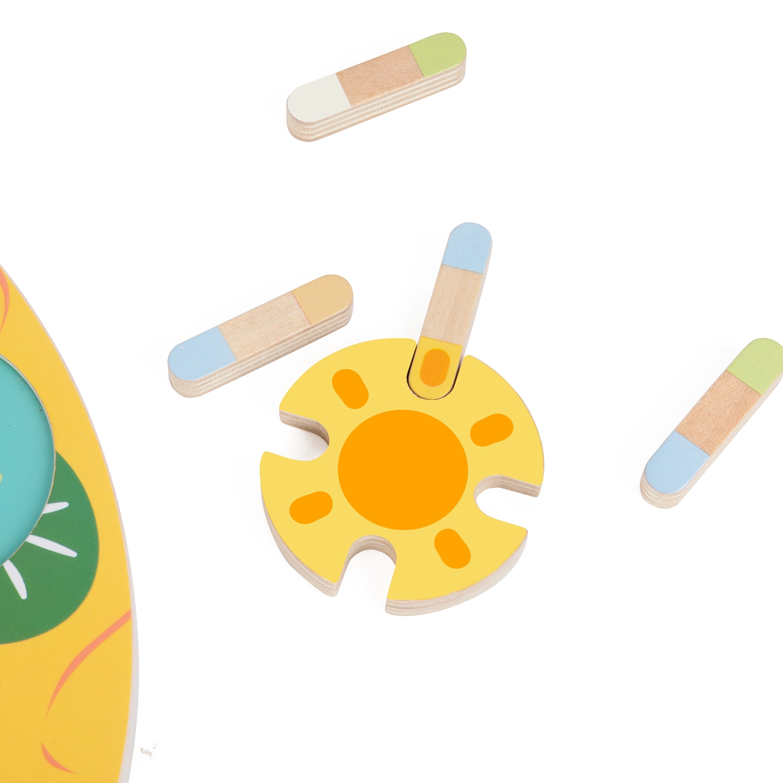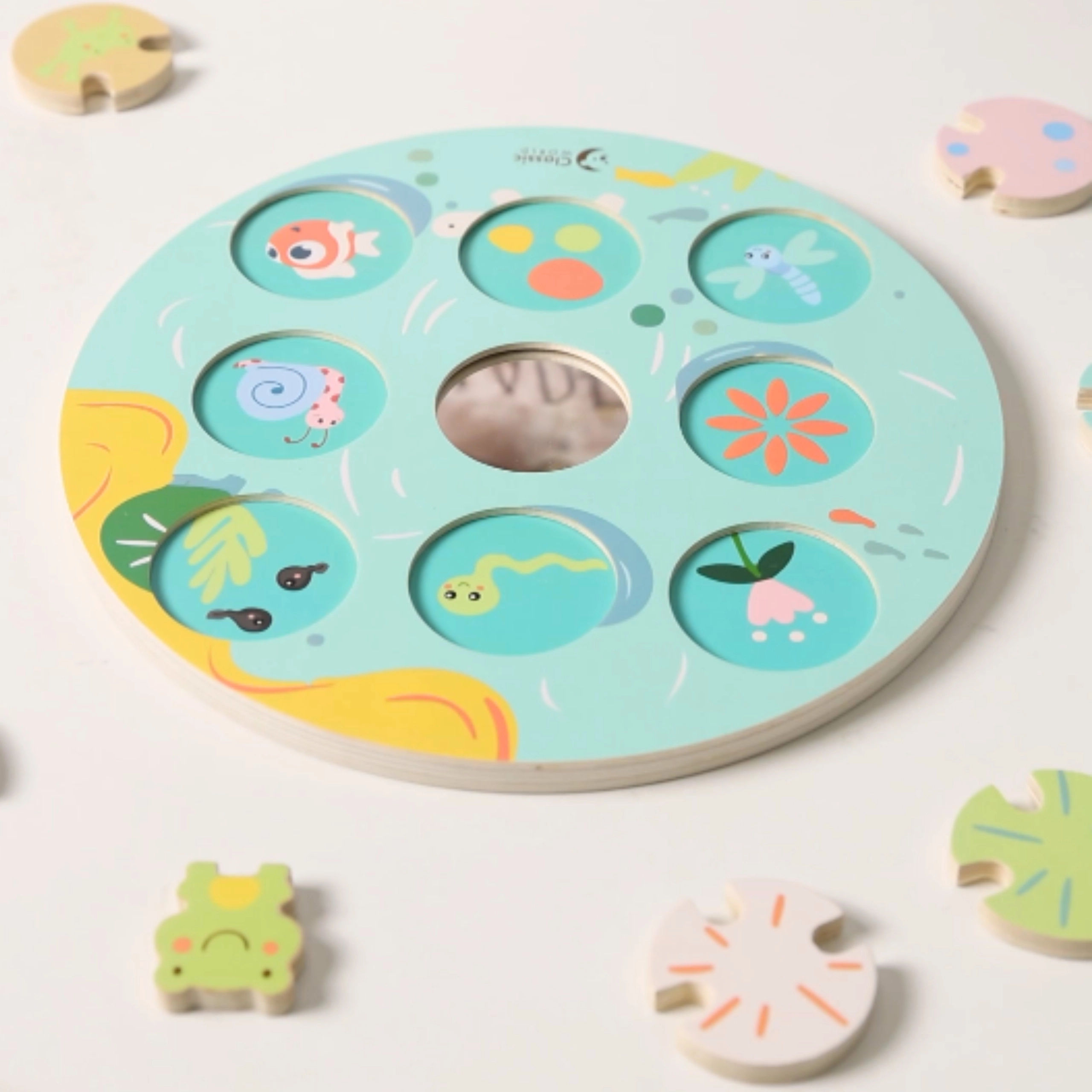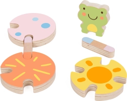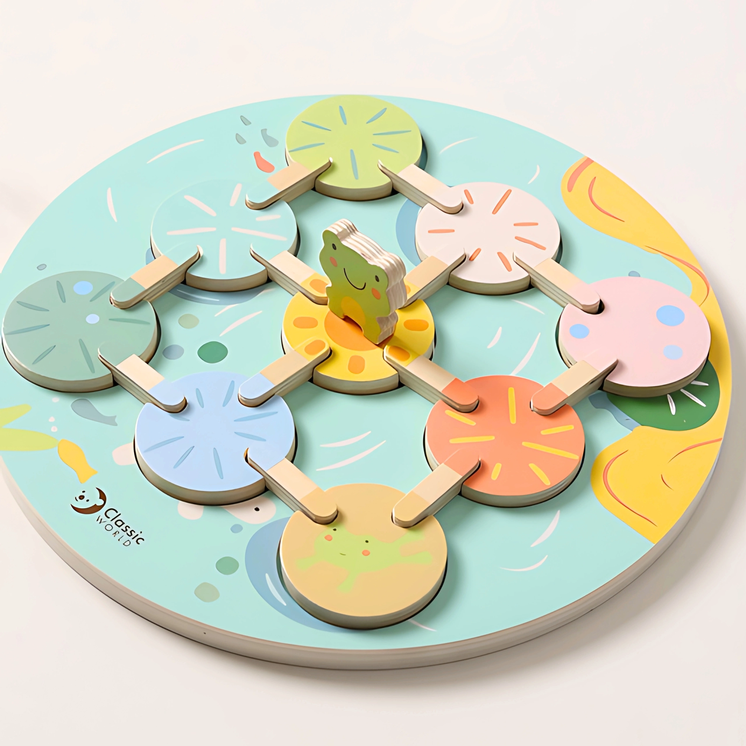Пъстрата дървена жабка и нежните пастелни оттенъци придават естетическа стойност на играта и подпомагат разпознаването на цветовете.