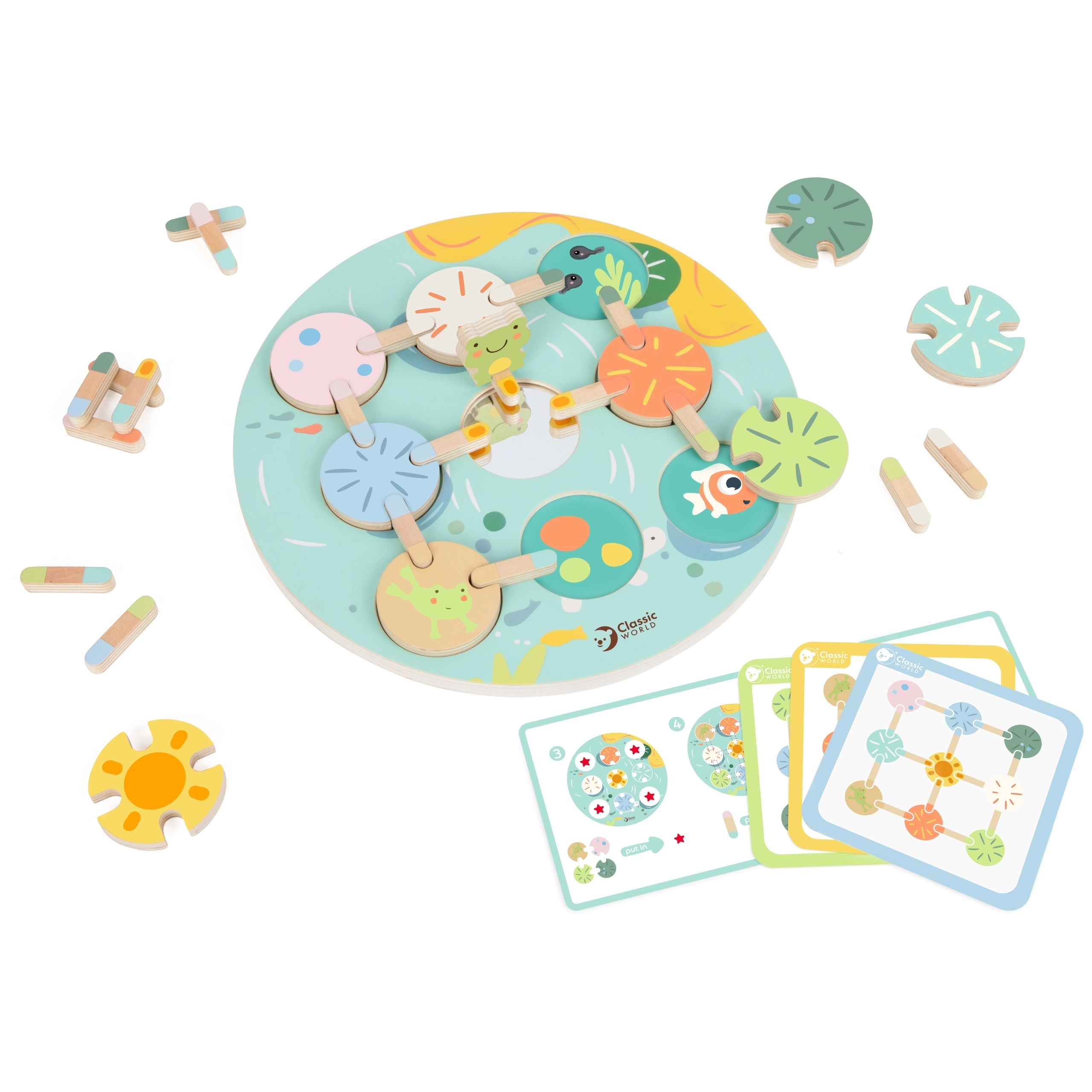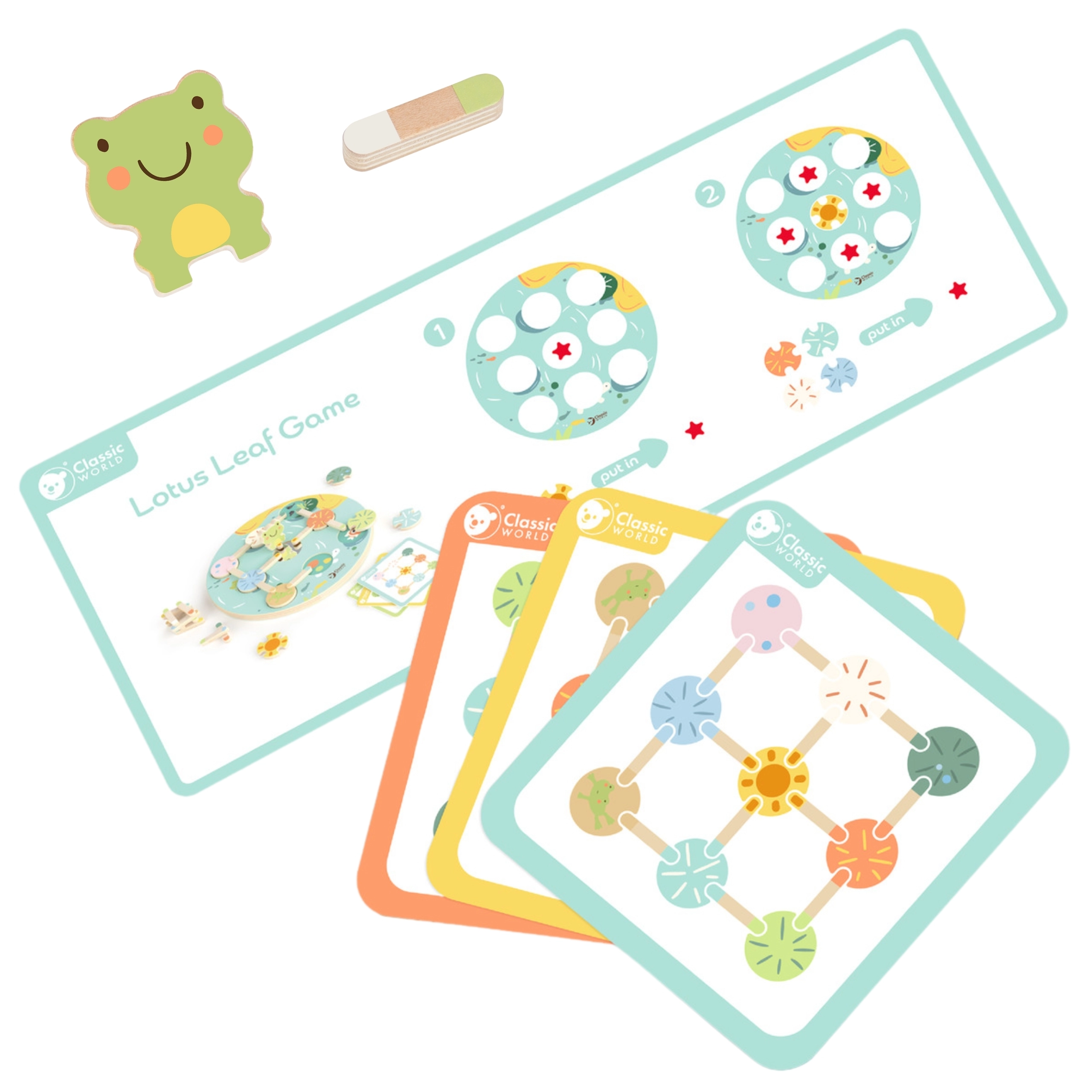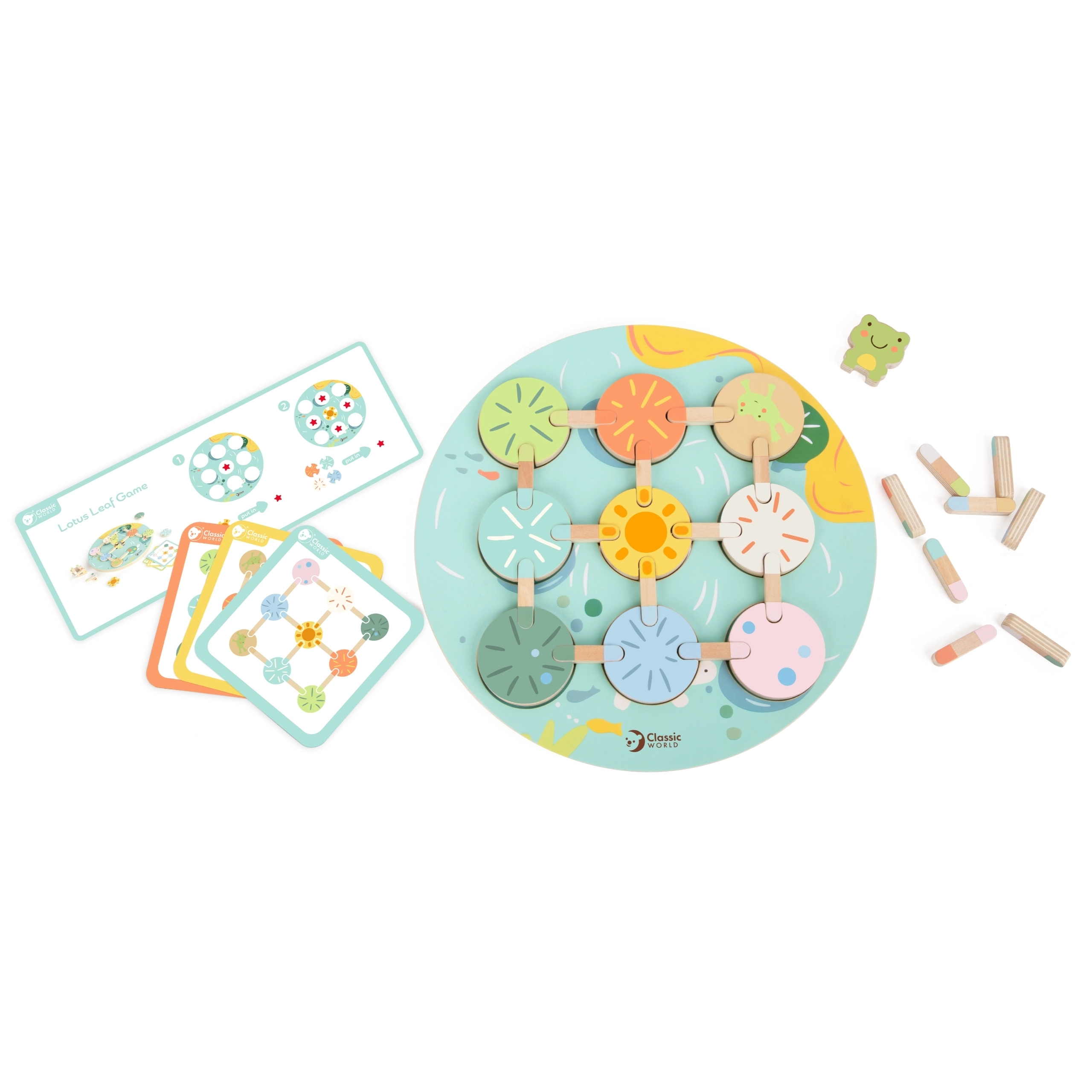 Сензорната игра Лист от лотос от Classic World въвлича вашето дете в свят, изпълнен с забавление и откривателство. С цветни дървени елементи, които могат да се комбинират, тази игра предлага безкрайни възможности за развитие на моторни умения и креативност.
