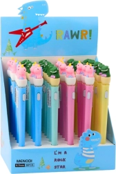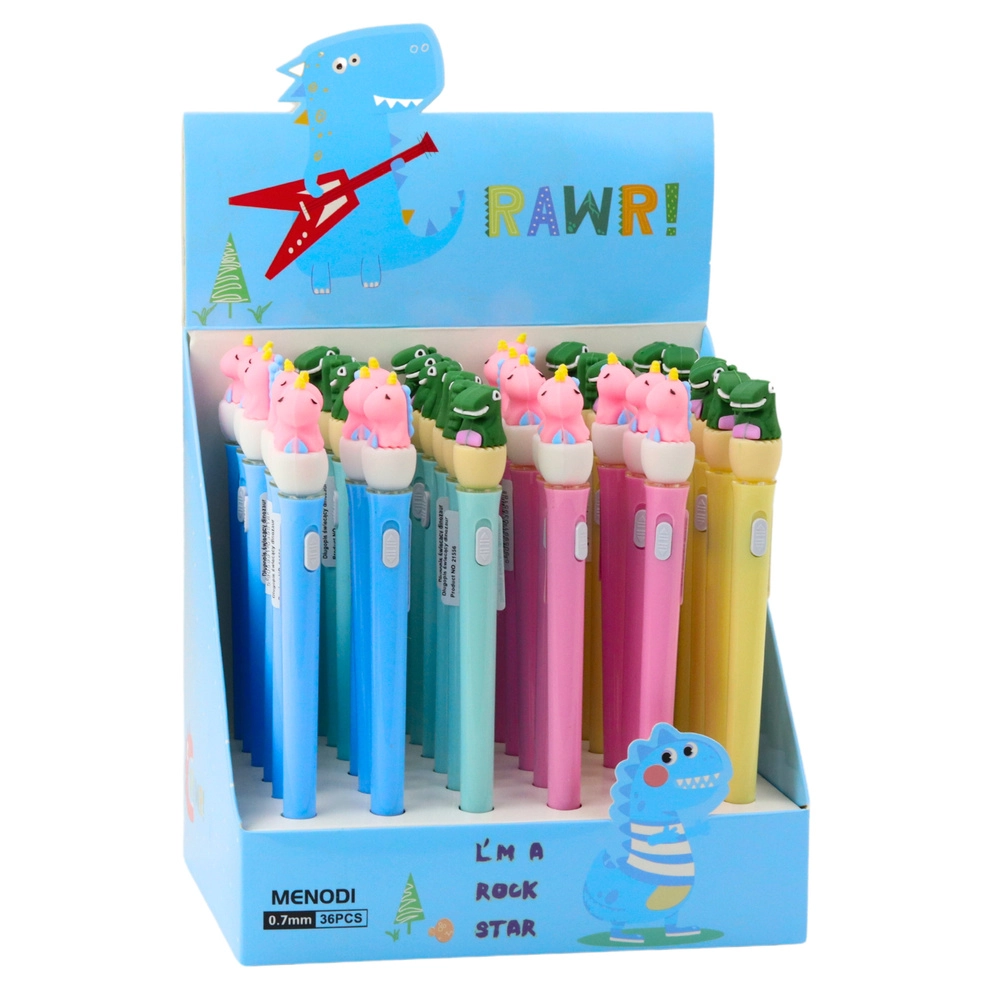 Горната част на писалката е украсена с гумена фигурка на динозавър, която служи като декоративен елемент и придава чар на целия продукт. Благодарение на капачката писецът е добре защитен от изсъхване, а вграден бутон активира ефектното LED осветление, което се включва при всяко натискане.
