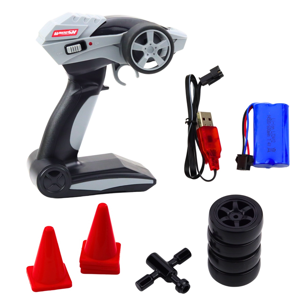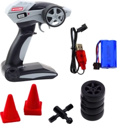 В комплектa са включени резервен комплект гуми, ключ за тяхната подмяна и конуси за тренировка на дрифт. Този модел развива моторните умения, рефлексите и страстта към техниката и спортното шофиране.