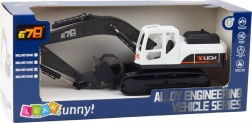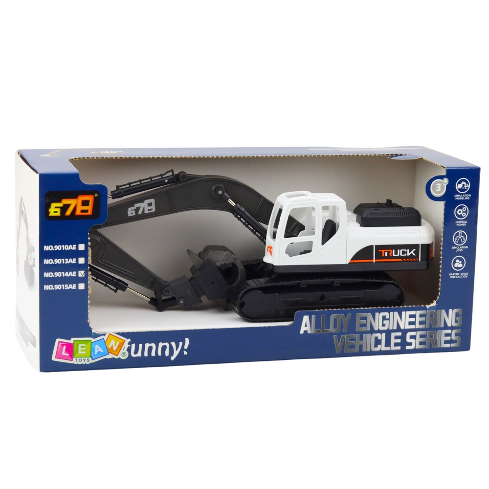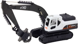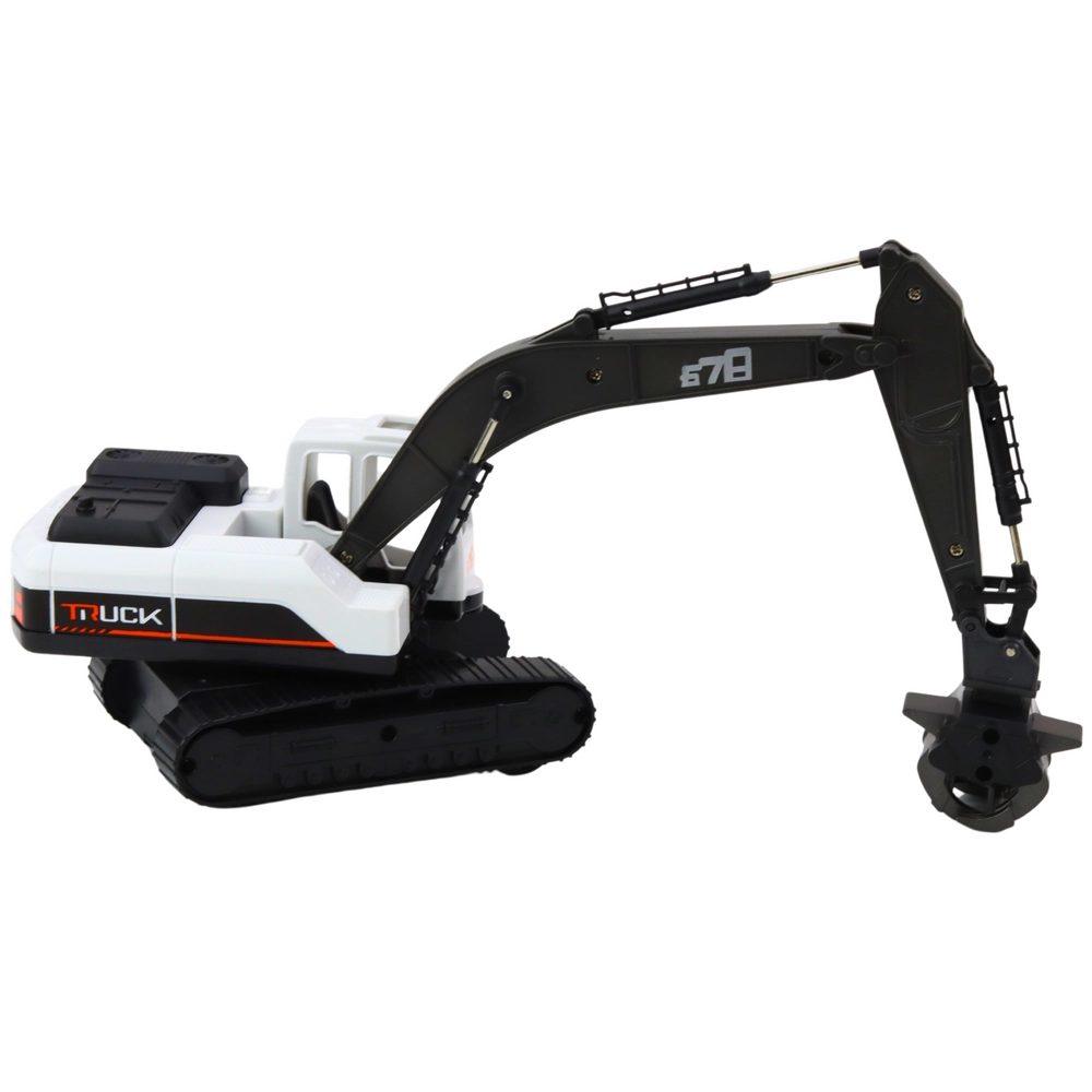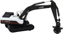 Верижният багер е оборудван със захват вместо традиционна кофа, има шарнирно рамо с няколко подвижни точки и 360° ротация на основата. Веригите на шасито осигуряват стабилност и здрав външен вид като при истинските строителни машини. Моделът в модерна черно-бяло-сива цветова комбинация се вписва идеално във всяка колекция от строителни играчки.