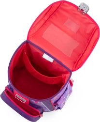 Раницата се състои от едно просторно отделение, което лесно побира всички учебни пособия. Дъното е от здрав материал за защита на съдържанието. Закопчаването е с предпазна метална тока със светлоотразител. Предният джоб е предназначен за закуска, а светлоотразителните елементи осигуряват видимост.