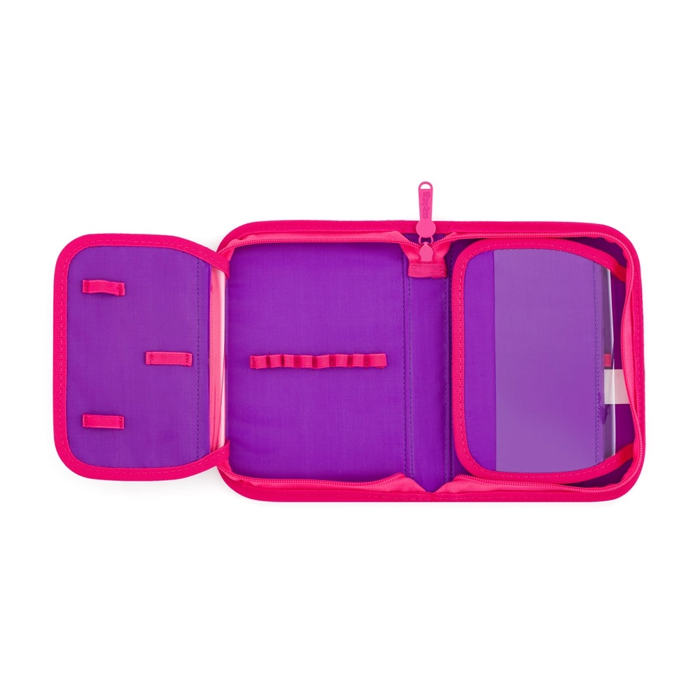 Към комплекта е включена практична торбичка за спортен екип или пантофи, която се затваря лесно чрез стягане на връзките. Едноетажният училищен несесер с две клапи предлага ластични фиксатори за закрепване на писмени принадлежности и прозрачна вложка за програма.