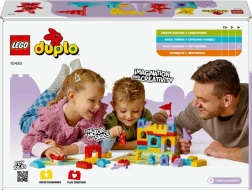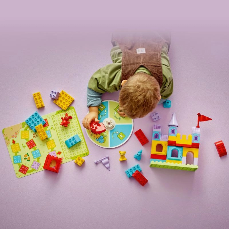 Тази умна игра и конструктор 2 в 1 от LEGO DUPLO носи на децата забавно учене чрез игра. Постройте заедно цветен замък, завъртете стрелката и придвижвайте животинските фигурки по игралното поле. Според цвета, на който спрете, добавяте към замъка правилното блокче – побеждава отборният дух, когато всички фигурки достигнат замъка!