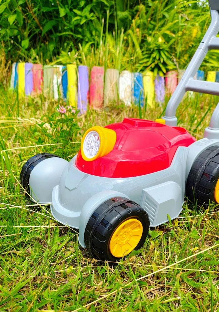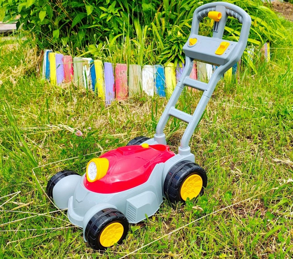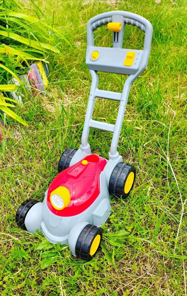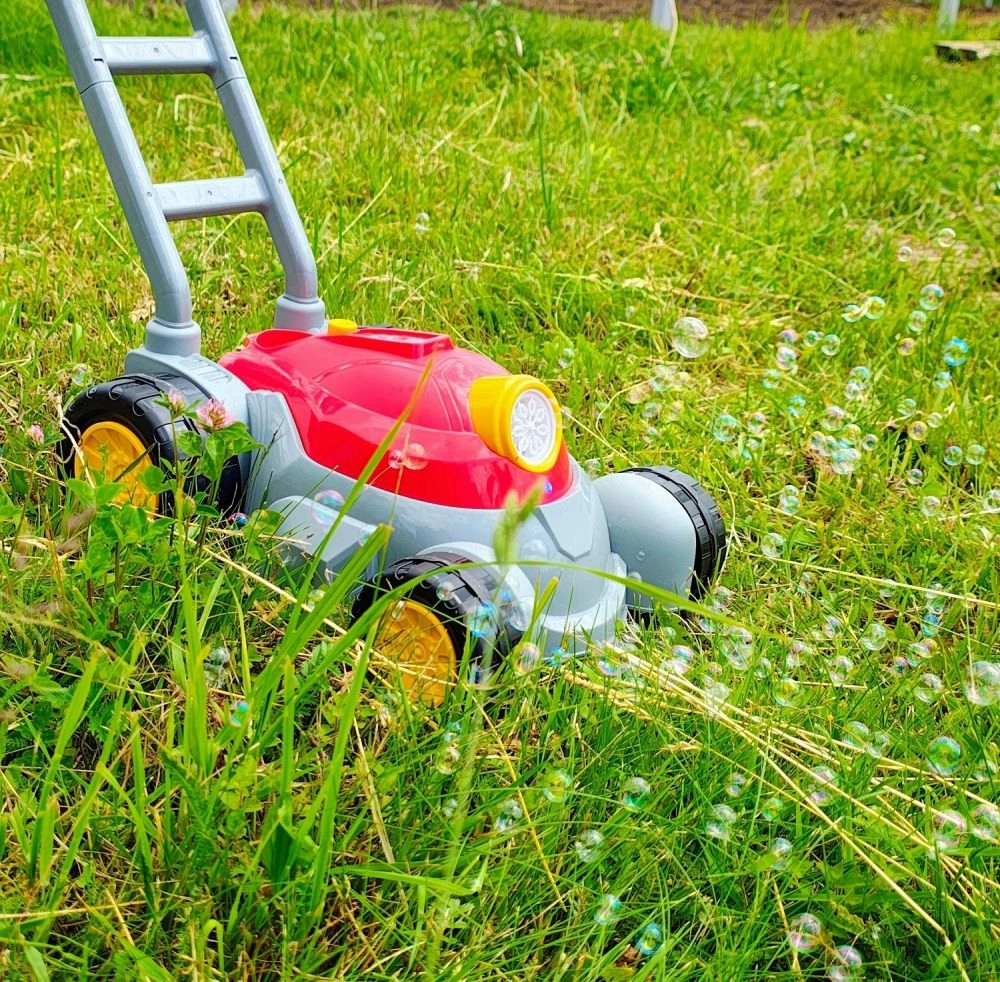 Тази детска бубъл косачка предлага два режима на игра: първият осигурява непрекъснато издухване на мехурчета, вторият добавя светлини и музика за още по-голямо забавление. Достатъчно е да завиете включения разтвор в долната част, да натиснете бутона и да гледате как предната част на „мотора“ се превръща в бубъл шоу.