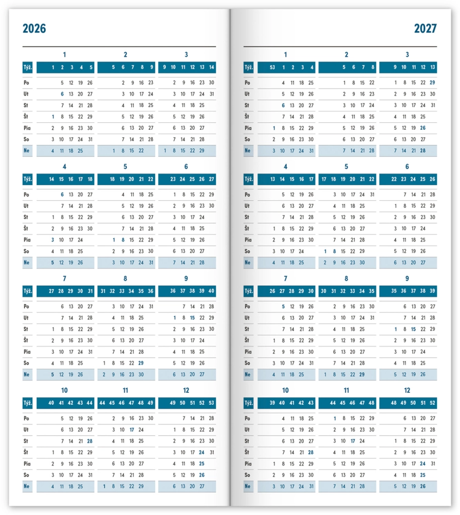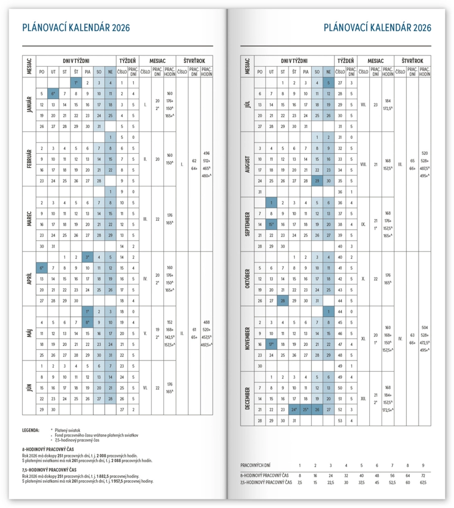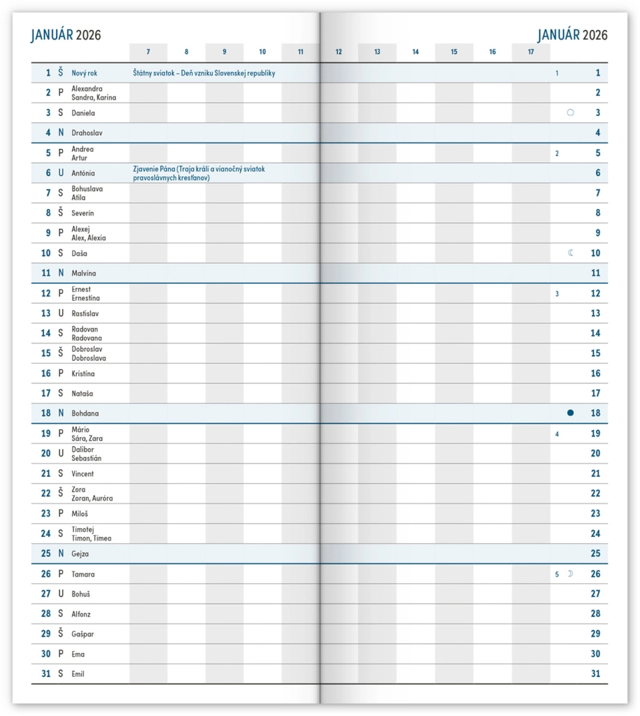 Практичен тънък дневник в син цвят с месечно разположение, който се побира навсякъде. Съдържа словашки календар, празници и паметни дни.