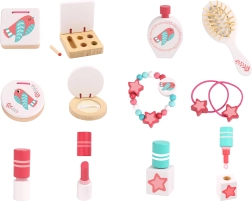 - Комплектът включва дървени аксесоари: лак за нокти, червило, гривна, обеци, четка за коса, парфюм, пудриера и сенки за очи.