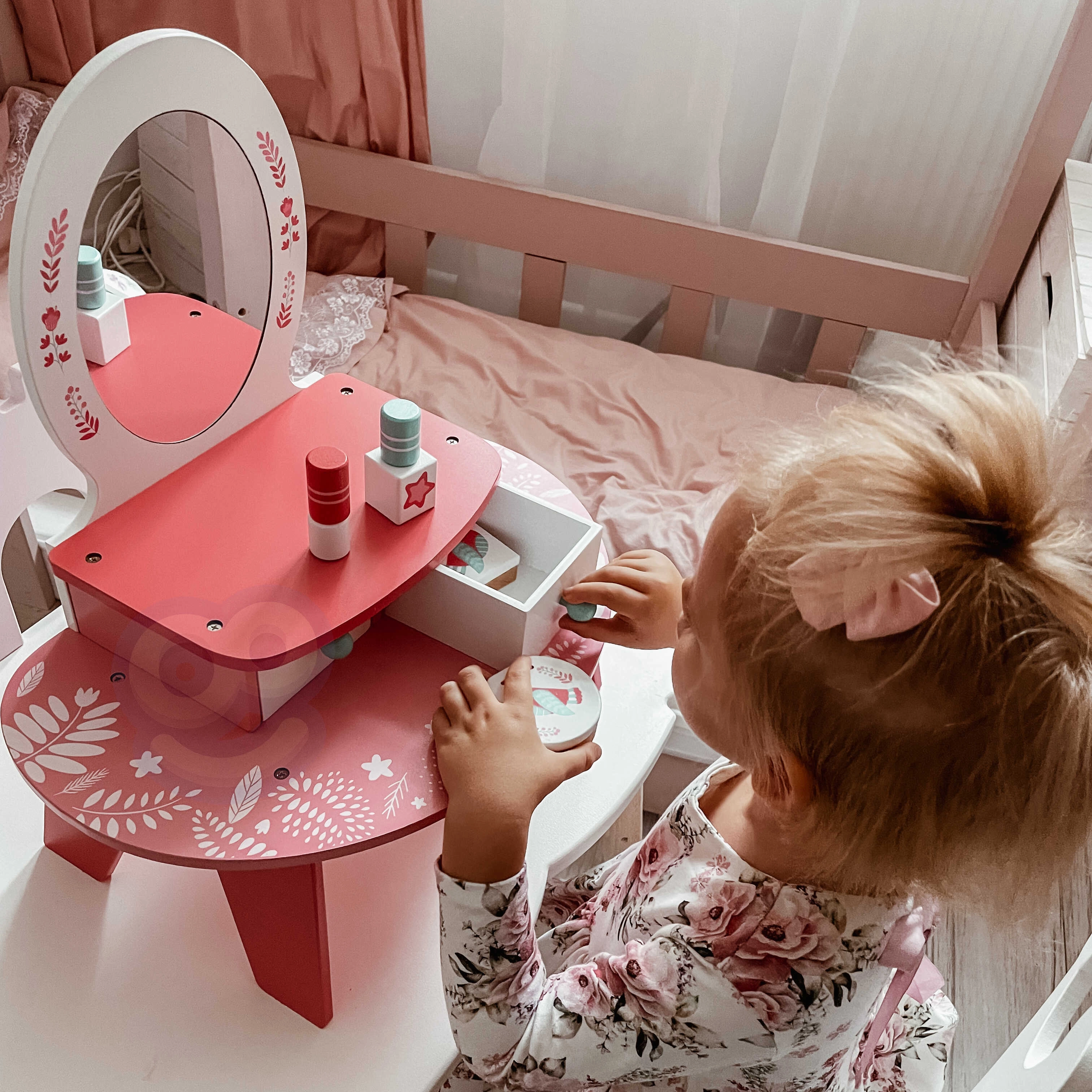 - Розовата тоалетка позволява на момичетата да създават грим заедно с мама.