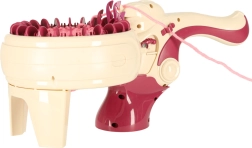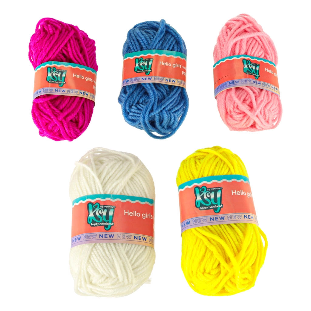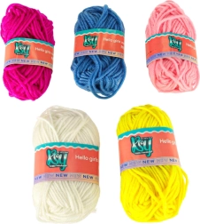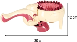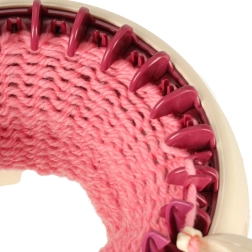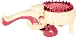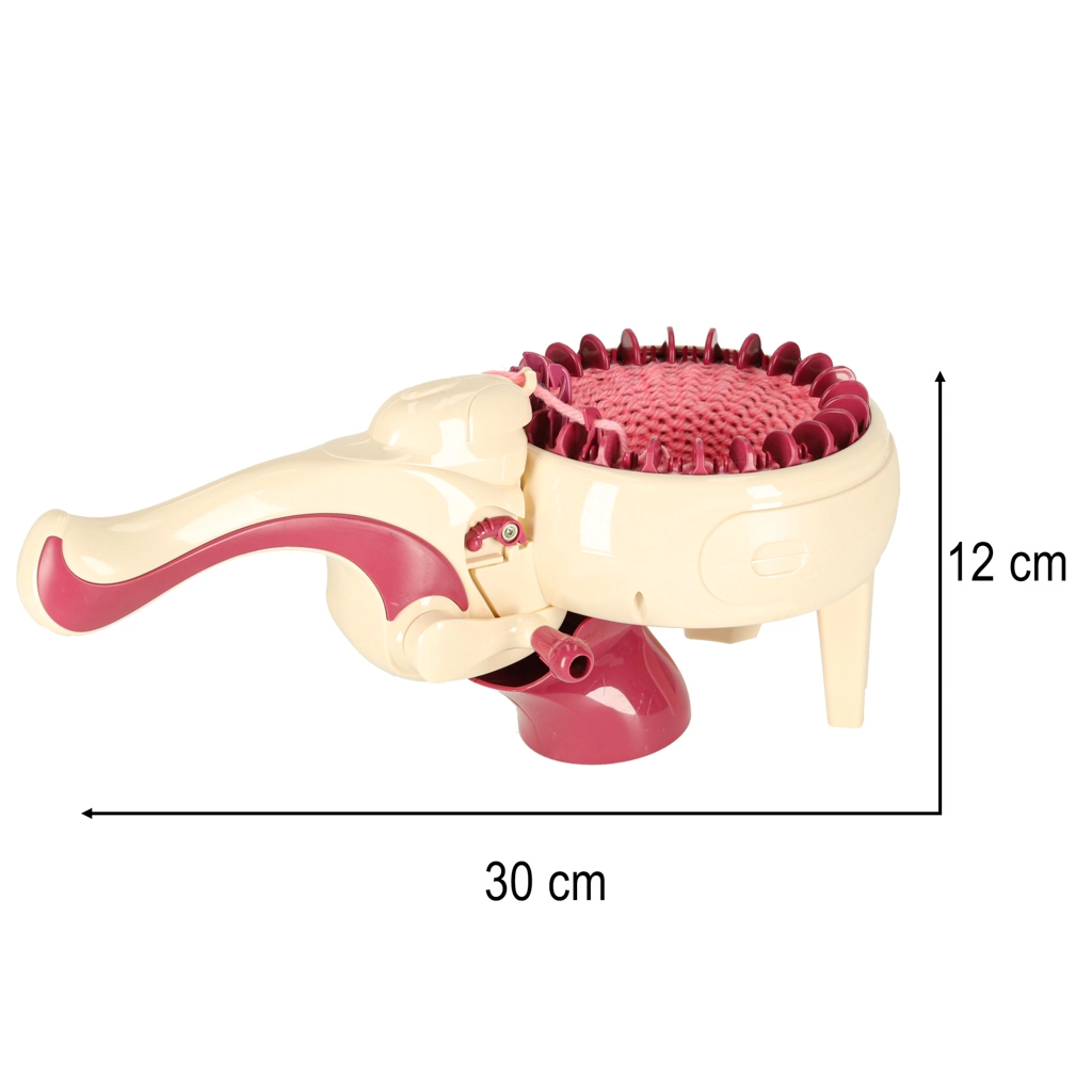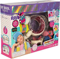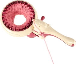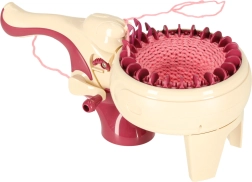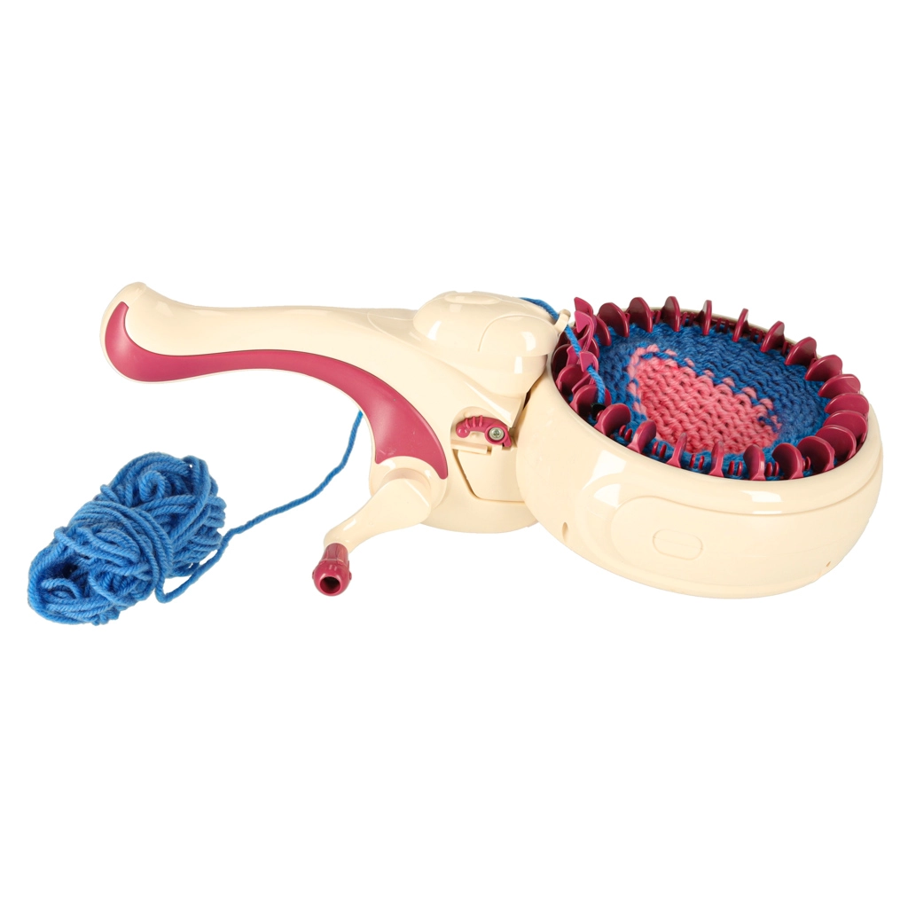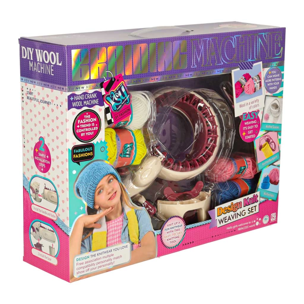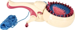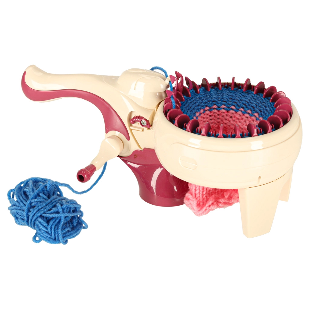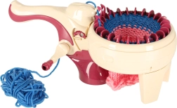 С интегрираната плетачна машина можете лесно да плетете различни проекти – от шалове до шапки. Комплектът съдържа всичко необходимо: 1 плетачна машина, стабилизираща основа, игла и кука. Цветовата палитра на преждите включва жълто, синьо, бяло, лилаво и розово, което позволява широка гама комбинации и дизайни.