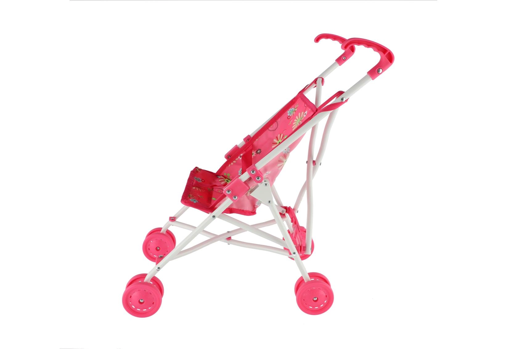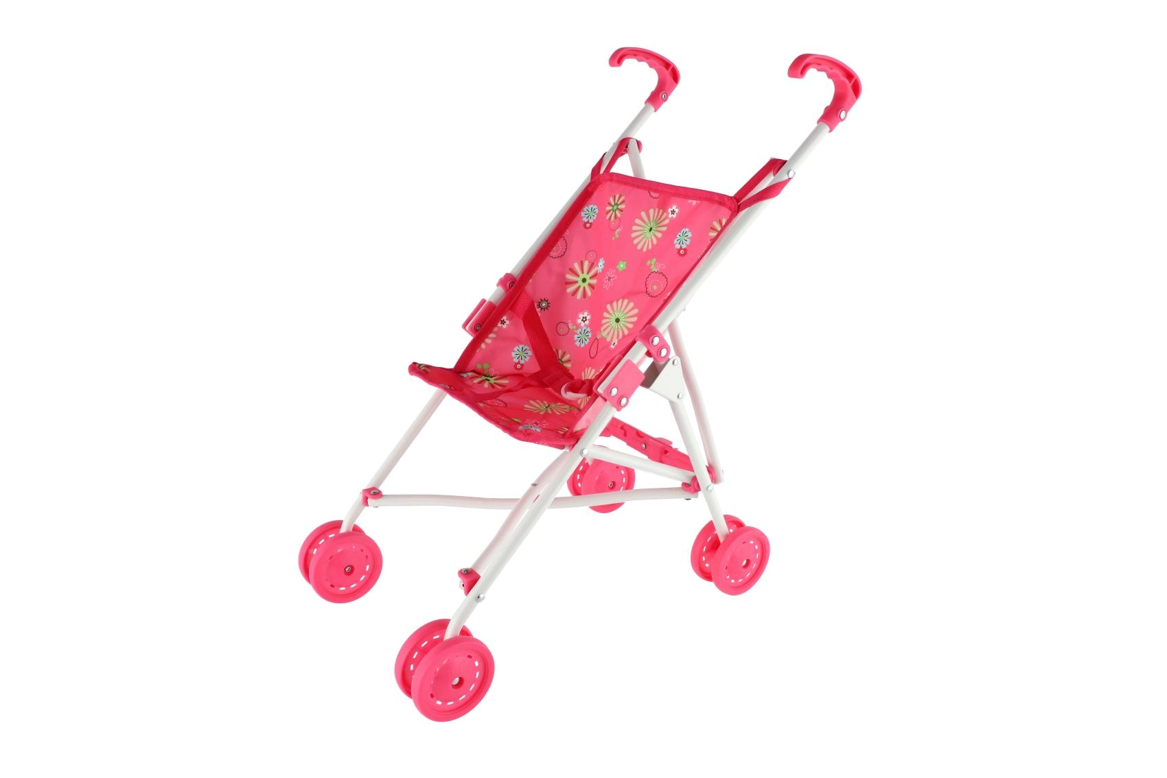 Тази розова количка за кукли с цветен десен е практична, лека и създадена за ежедневна игра. Децата ще оценят удобните дръжки, плавното движение на четирите двойни колела и предпазния колан, който държи куклата на място. Конструкцията е от метал, а покритието от издръжлива материя – лесна за поддръжка и дълготрайна.