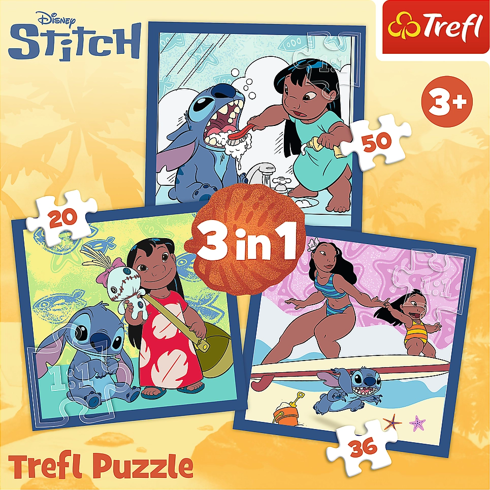 Открийте забавния пъзел 3 в 1 с любимите герои от LILO & STITCH. Всяка от трите картинки има различен брой части, така че детето може да избере трудност според настроението и възрастта. След подреждане се получават три цветни изображения, от които най-голямото е 200 × 195 мм.