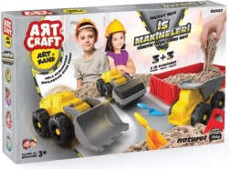 - Комплектът включва различни строителни превозни средства и кинетичен пясък.