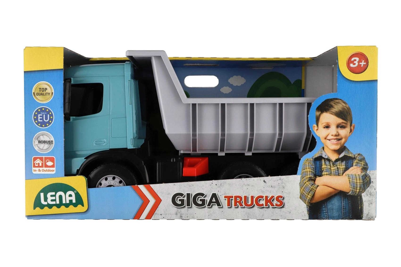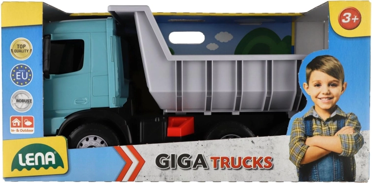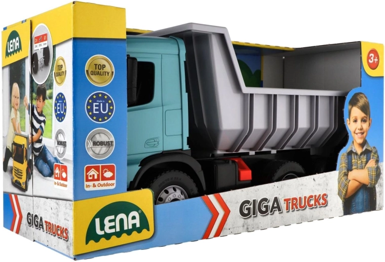 Този здрав самосвал от серията Giga Trucks е създаден за малки строители. Благодарение на голямата повдигаща се каросерия с блокировка без усилие превозва и по-големи товари и ги разтоварва безопасно. Реалистичните детайли на кабината AROCS насърчават креативна и тематична игра на строежа, в градината и в детската стая.