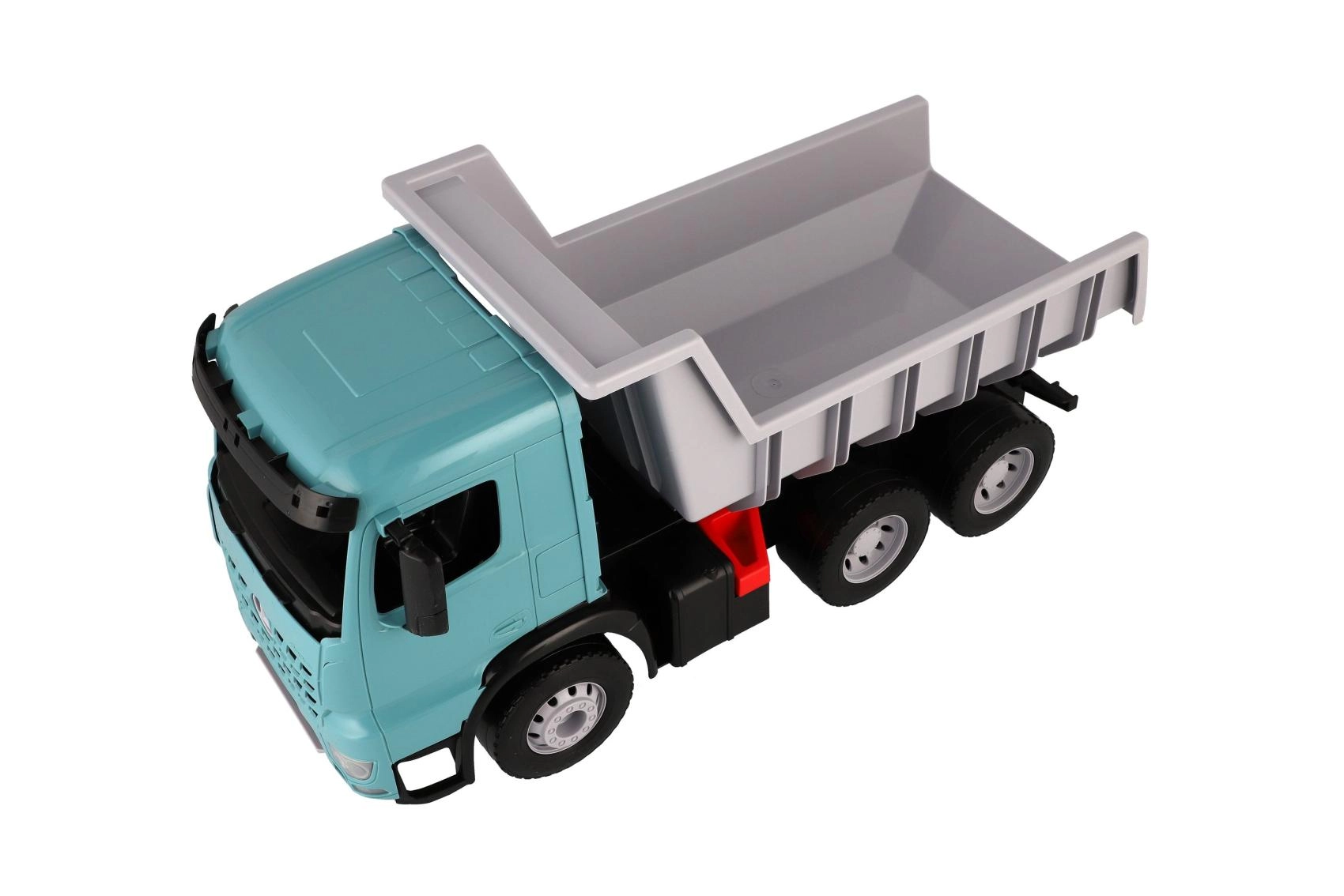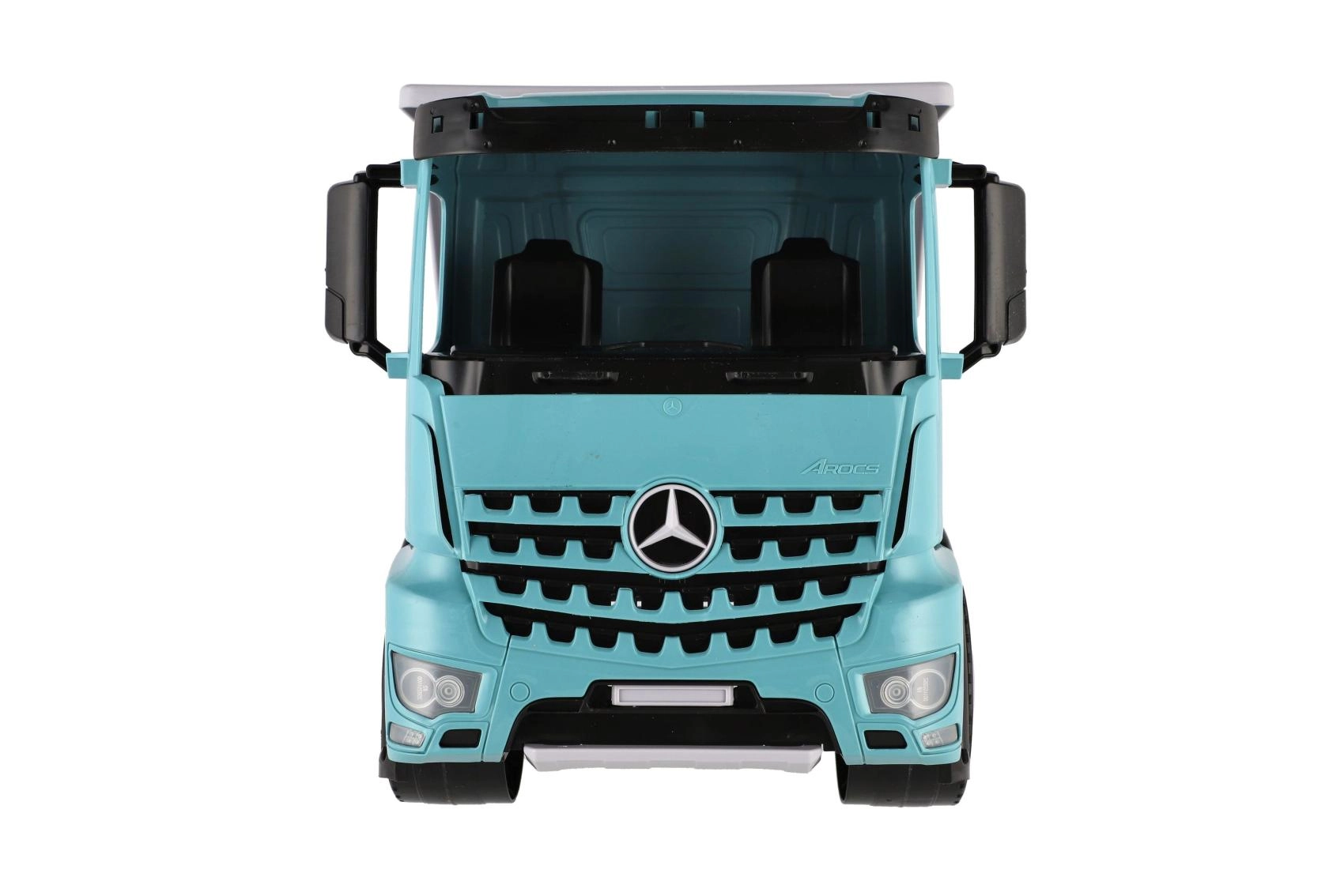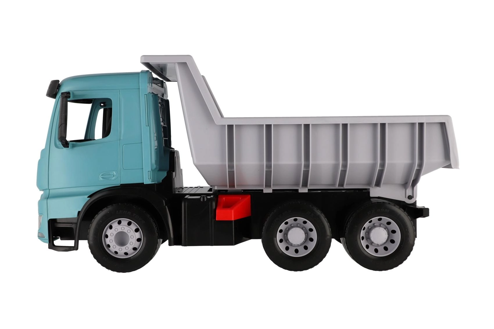 Голям пластмасов самосвал за деца от 3 години с реалистичен вид на MERCEDES-BENZ AROCS. Предлага просторна каросерия с практична блокировка срещу нежелателно накланяне, здрава конструкция от качествена пластмаса и модерна тюркоазено‑сива цветова комбинация. Идеален за игра у дома и навън, за превоз на пясък, играчки и въображение.