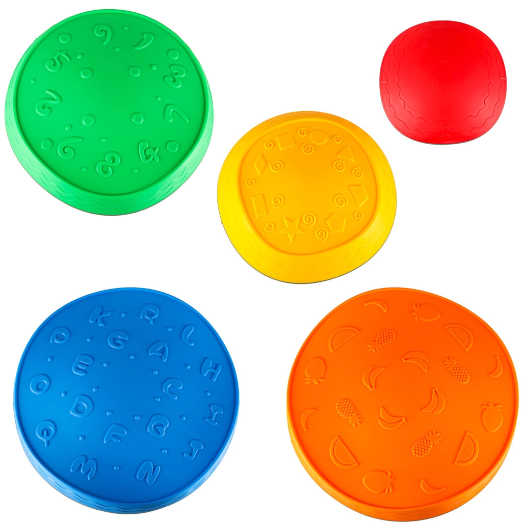 Благодарение на здравата конструкция и противоплъзгащите подложки камъните остават стабилни върху различни подови настилки. Издръжливият полиуретан е приятен на допир и се почиства лесно. Цветните мотиви (числа, букви, форми, плодове, шарки) подпомагат обучението чрез игра и развитието на фината и грубата моторика.