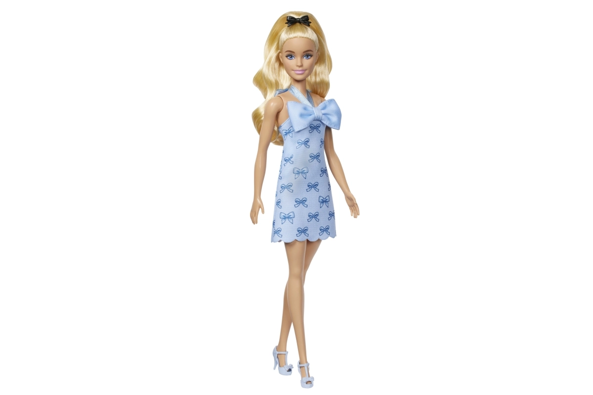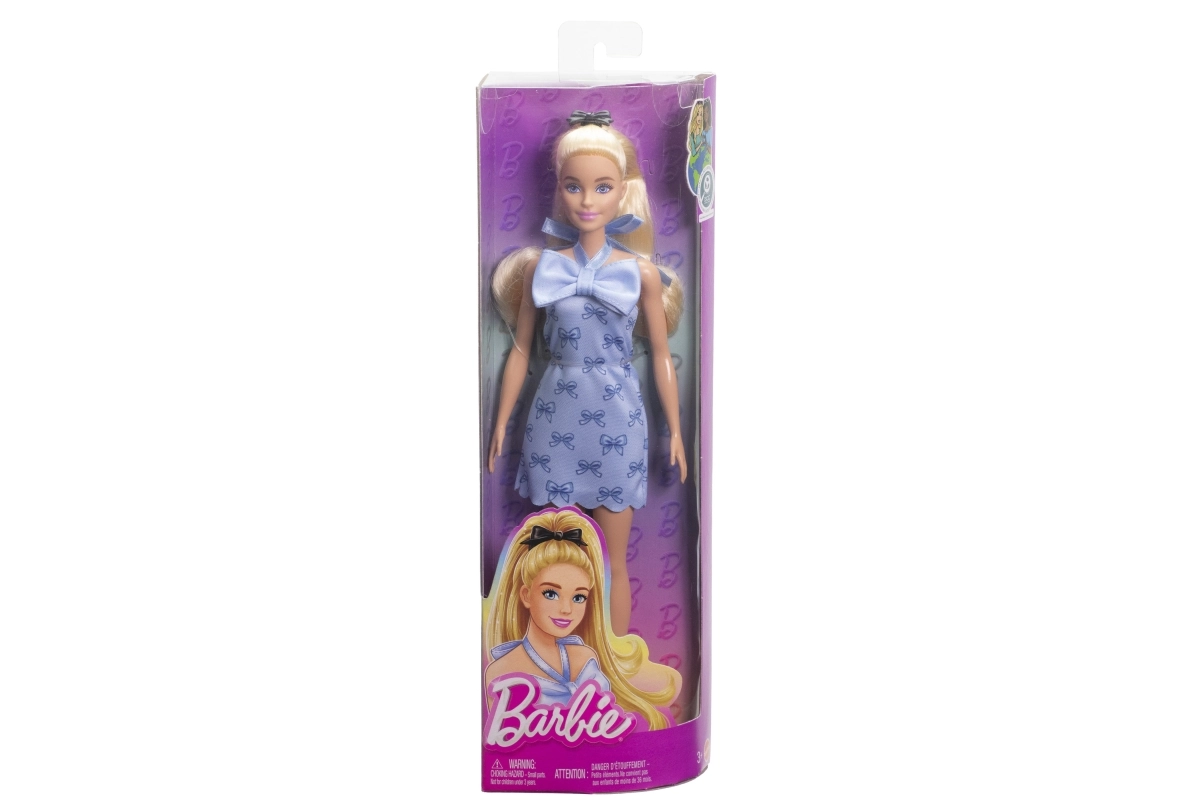 Тази модерна Barbie Моделка сияе в светлосиня рокля, украсена с принт на панделки и ефектна панделка при деколтето. Дългата руса коса с елегантна черна панделка и съчетаните обувки придават на куклата иконичен вид, в който ще се влюбите веднага. Благодарение на подвижните стави лесно заема естествени пози, което насърчава въображението и развитието на фината моторика.