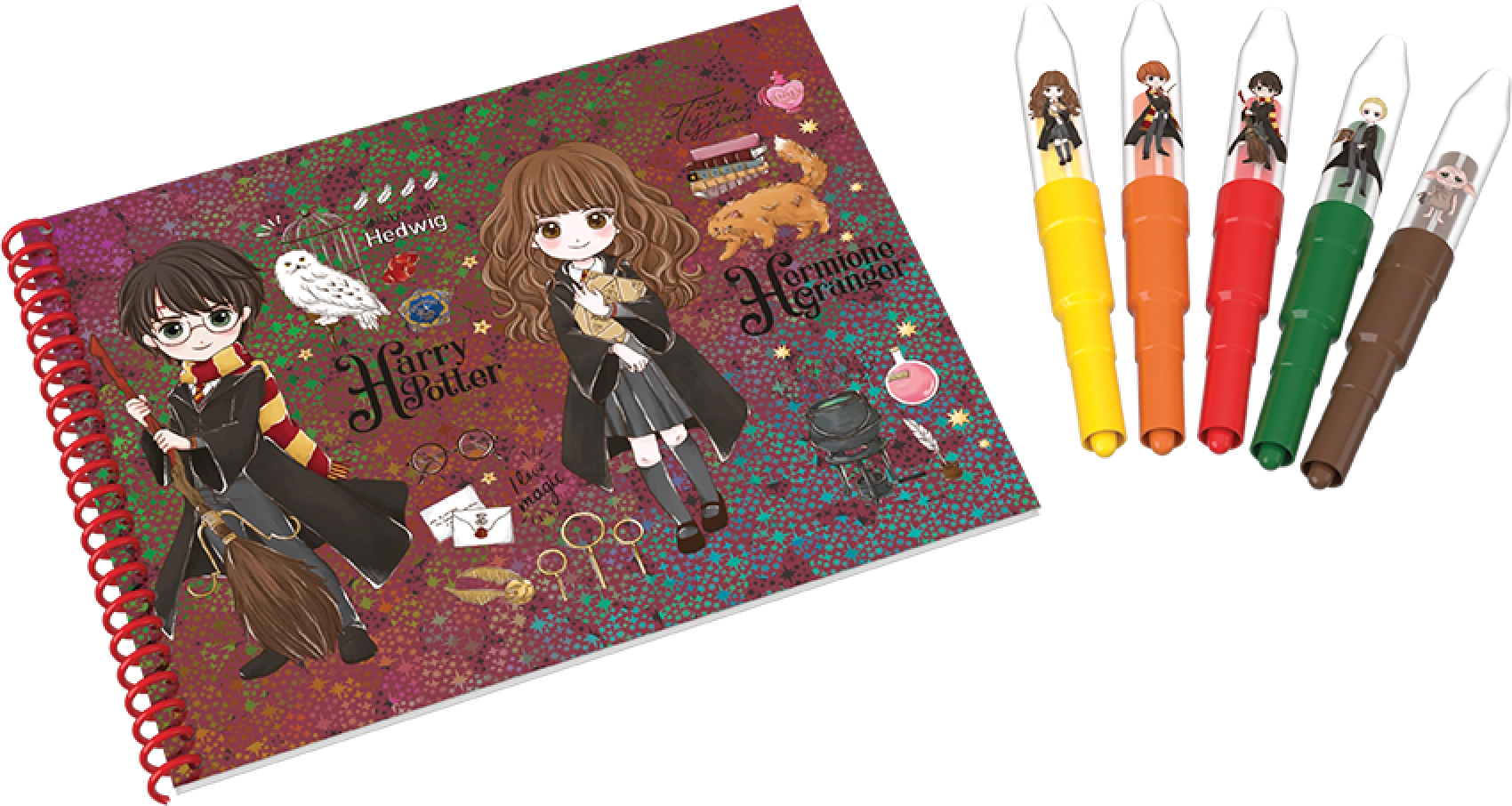 Комплектът флумастери за духане с мотиви от Harry Potter предлага забавление и творческо изразяване. Децата могат с леко духане през флумастерите да създават цветни спрей ефекти. Освен флумастери, комплектът включва и тефтер, пълен с предварително отпечатани мотиви от Harry Potter, които могат да се оцветяват или допълват със собствени рисунки.