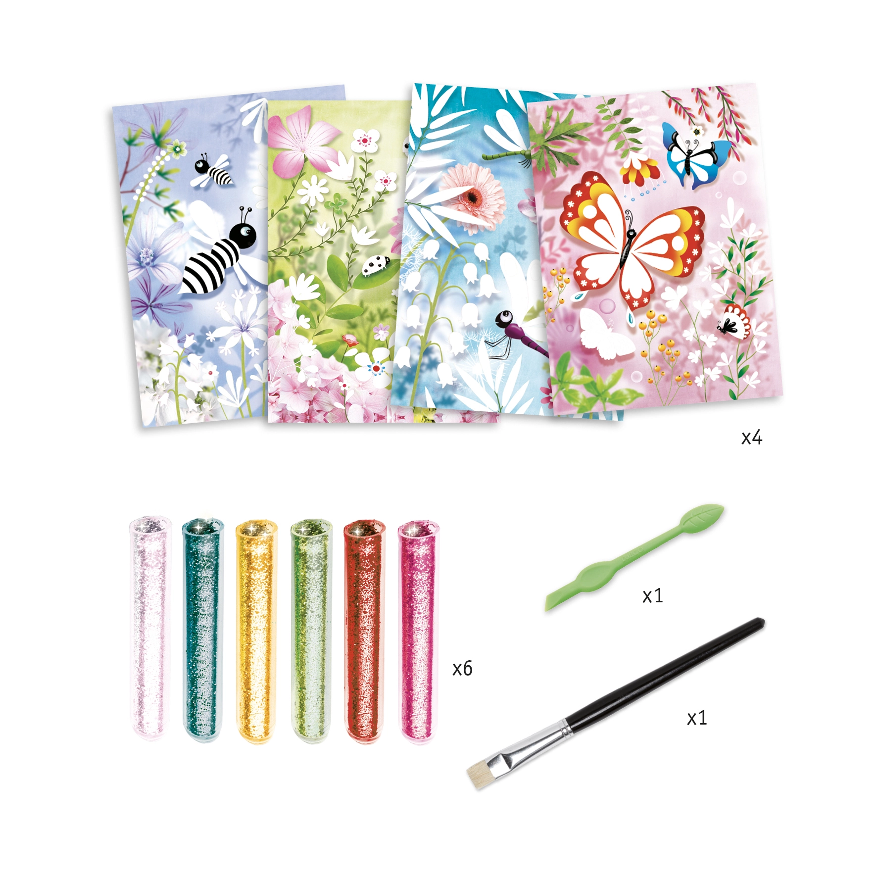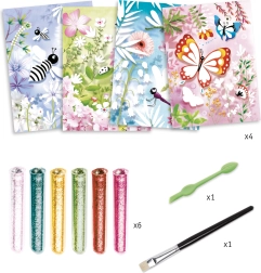 DJECO Блестящи пеперуди – рисуване с пясък е креативен комплект, който позволява на децата да създават красиви и сияйни пеперуди чрез пясъчна техника.