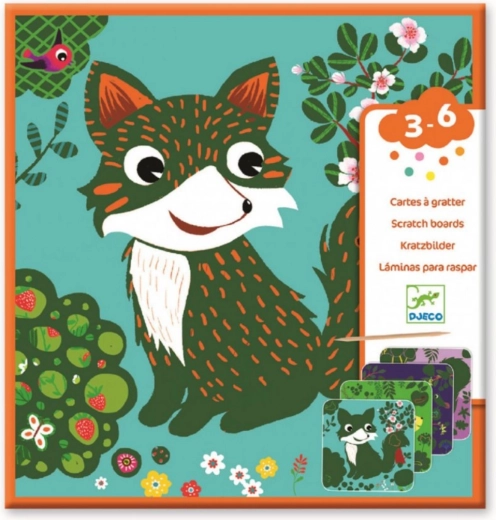 С този комплект скреч картини от DJECO децата развиват фината моторика и едновременно стимулират своята креативност. Всеки образ се разкрива, щом започнат да изстъргват повърхността със специалната писалка. Темите представят очарователни горски сцени и сладки горски обитатели, които ще спечелят сърцата на малките ръчички.