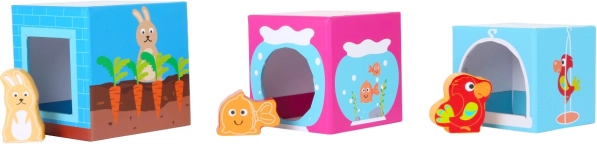 Пъстър комплект за подреждане с картонени кубчета и шест дървени животни за най-малките. Децата подреждат от най-голямото към най-малкото и тренират фина моторика, координация око–ръка и логическо мислене. Всяко животинче намира своя правилен дом в съответния отвор. Безопасна играчка за деца от 12 месеца.