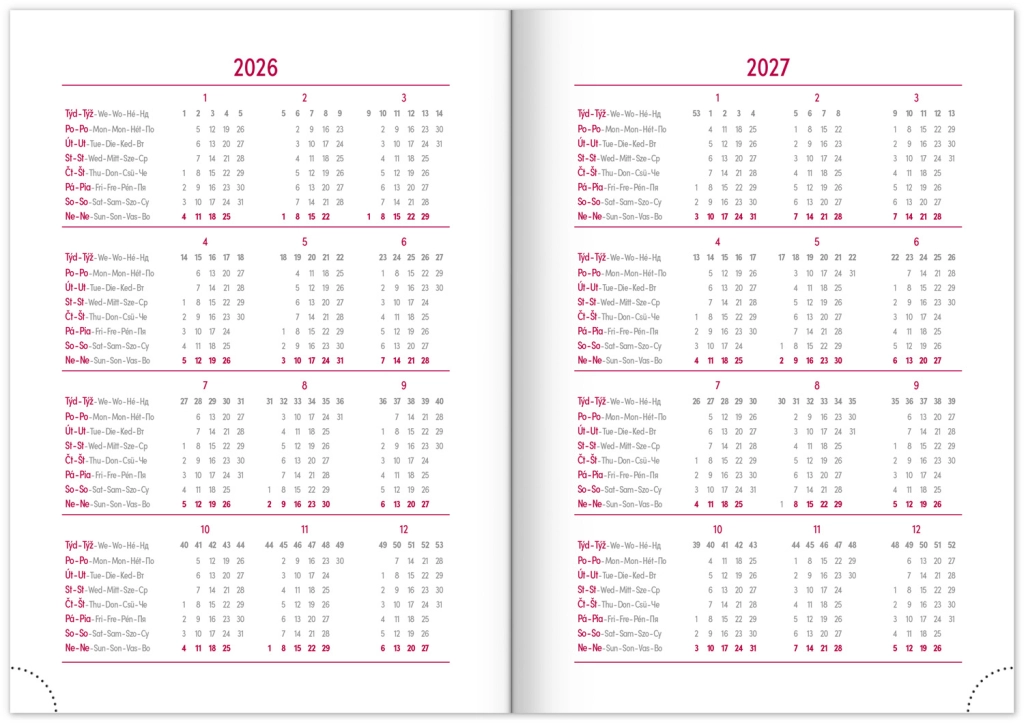 Елегантният дневен планер Balakon 2026 в стилен бордо цвят е идеалният спътник за ежедневното планиране. Планерът предлага издръжлива повърхност и чешко-словашко календариум, допълнено с други езикови варианти.