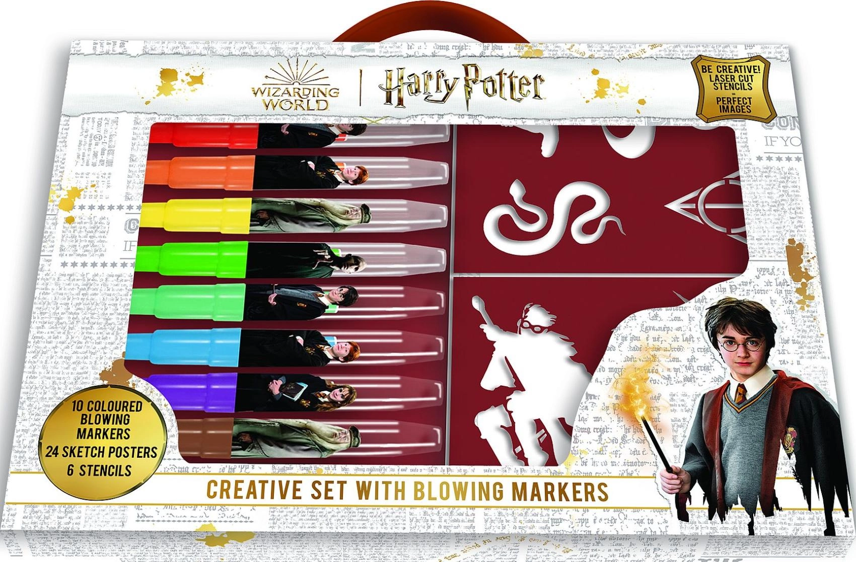 Вълшебно забавление за малки магьосници. Открий света на магията с този креативен комплект с флумастери за издухване с мотиви от Хари Потър. Нужно е само да поставиш флумастера в държача и да издухаш – и се получава оригинален спрей ефект.
