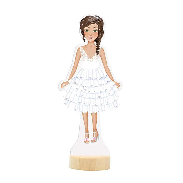 Магнитна кукла Сватба внася забавление и творчество в детската стая. С тази кукла децата могат да обличат своята фигурка в различни тоалети благодарение на трите листа с магнитни части на облекло, обувки и аксесоари.