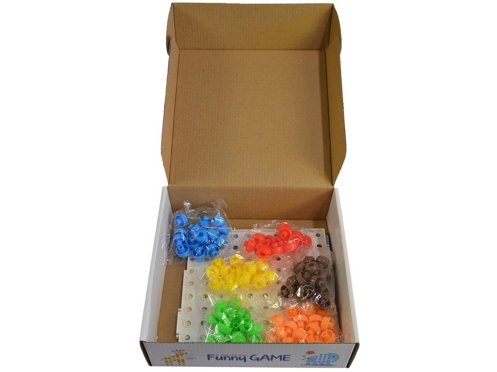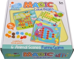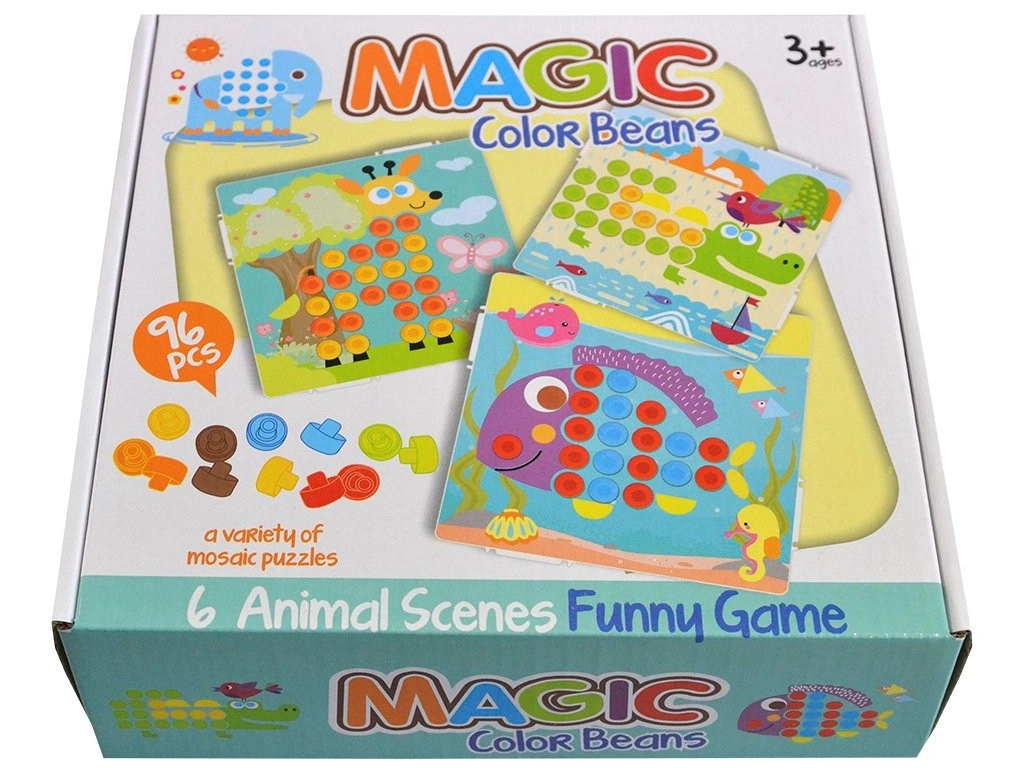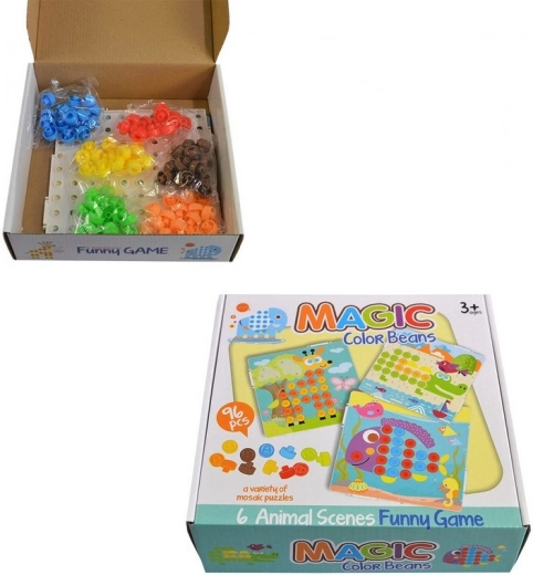Мозайка с цветни шаблони, идеална за креативни деца. Съдържа 6 различни среди, в които живеят животни. Децата могат да допълнят телата на животните с помощта на пъстроцветни пинове.