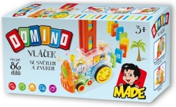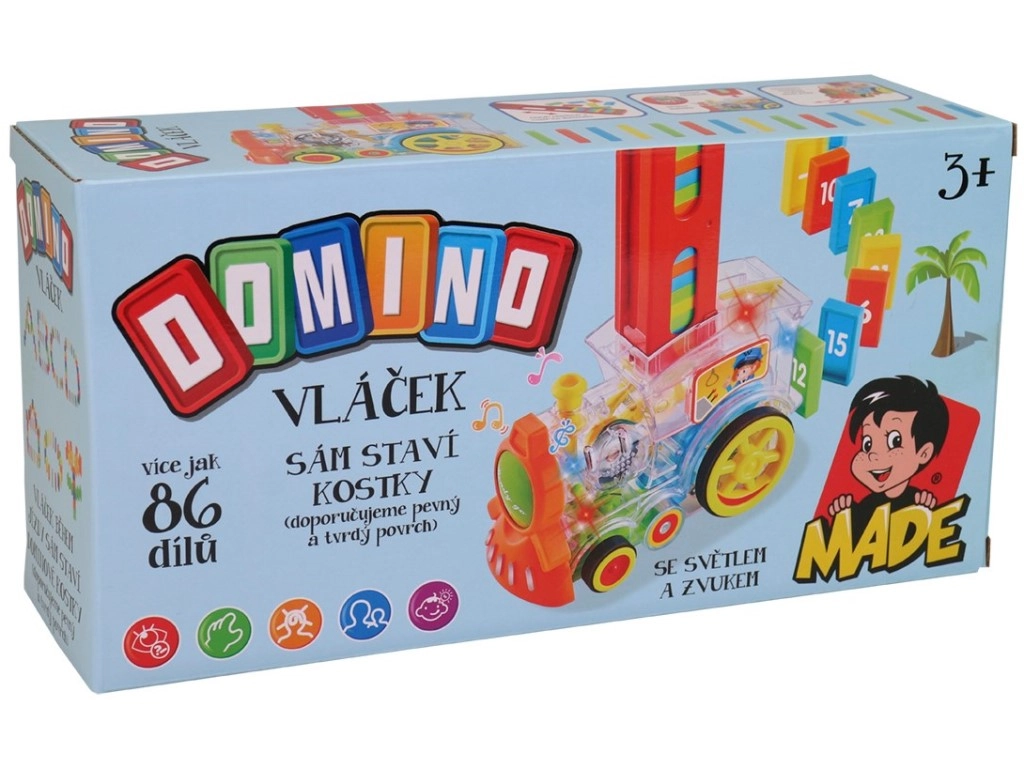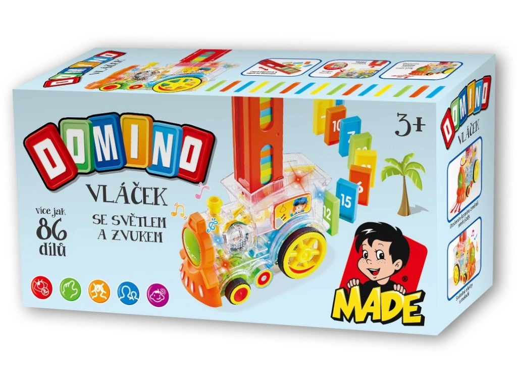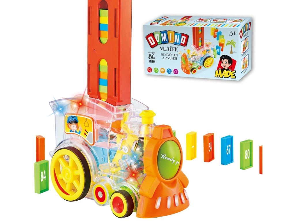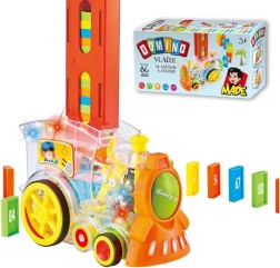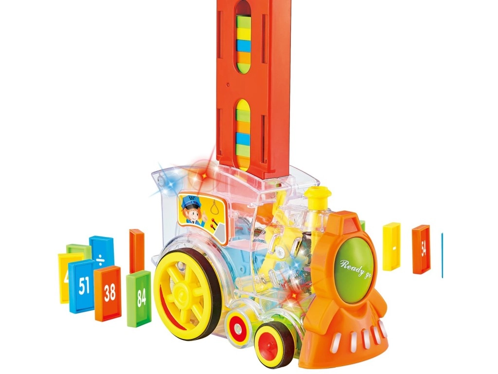 Прозрачният локомотив за деца предлага забавление с 86 броя домино и вълнуващи светлинни ефекти. Насладете се на музикално пътешествие, пълно с цветове и създайте перфектния домино ефект.
