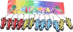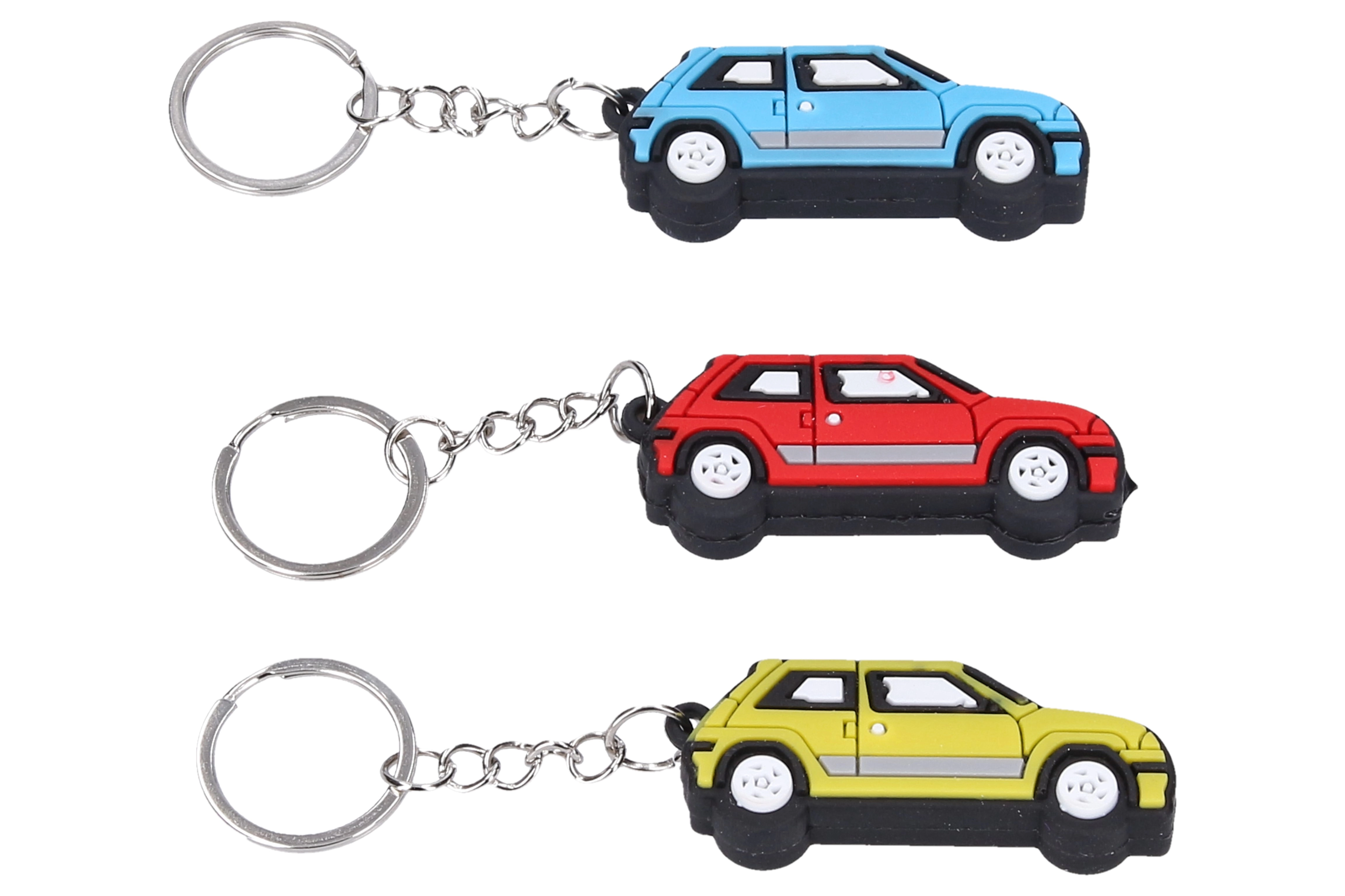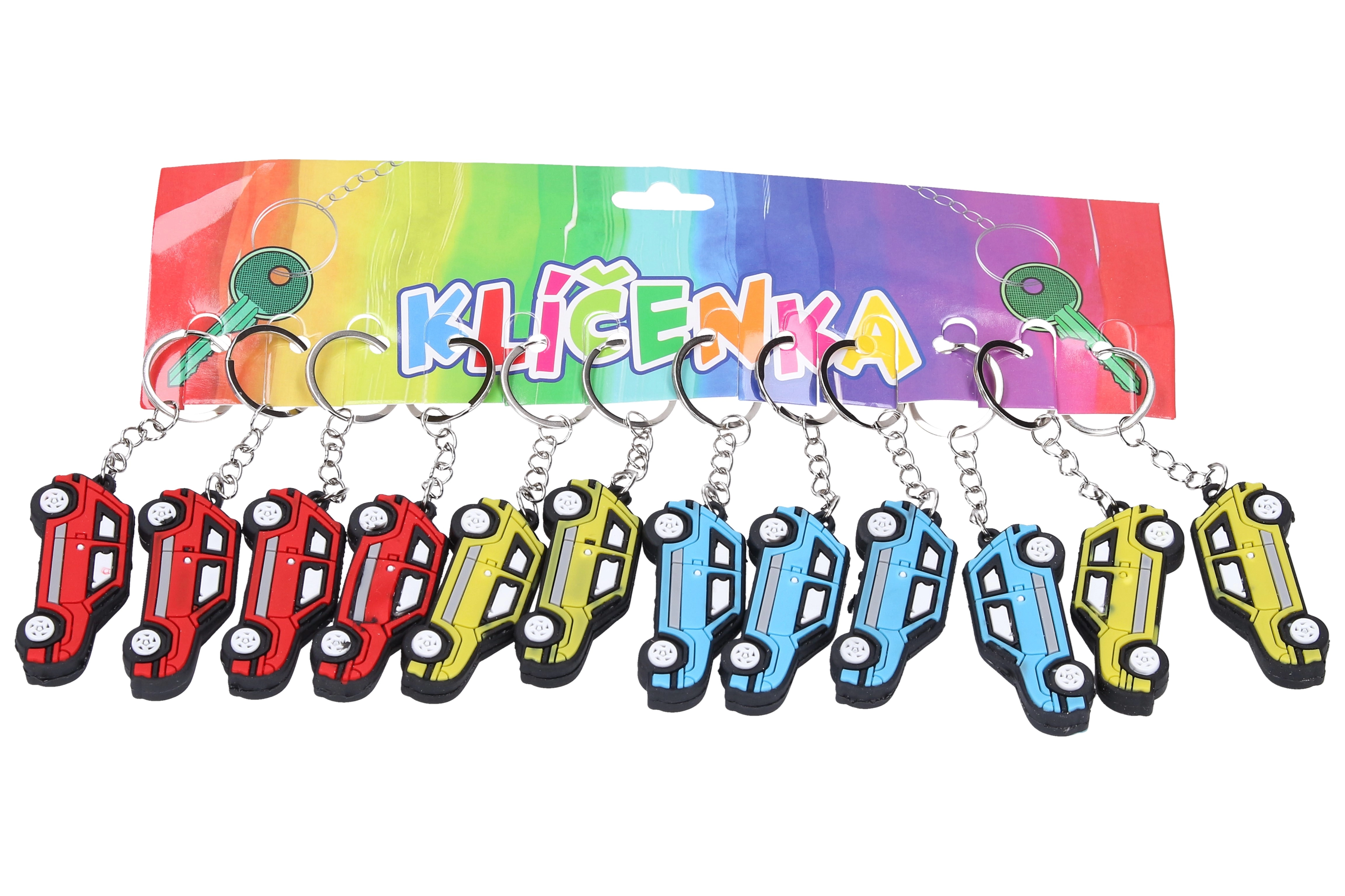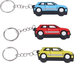 Стилен ключодържател във формата на кола, наличен в три ярки цвята: червен, жълт и син.