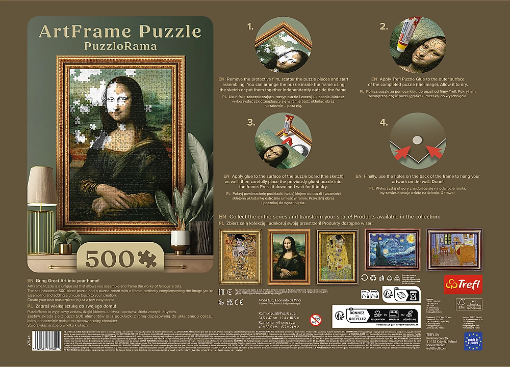 Открийте съвсем нов поглед към реденето на пъзели чрез серията PuzzloRama. Всеки комплект съдържа 500 части, които след подреждане създават красива репродукция на прочутия шедьовър Мона Лиза, поставена в елегантна рамка. В опаковката ще намерите всичко необходимо за релаксиращо и едновременно креативно изживяване.