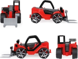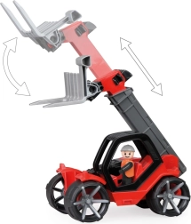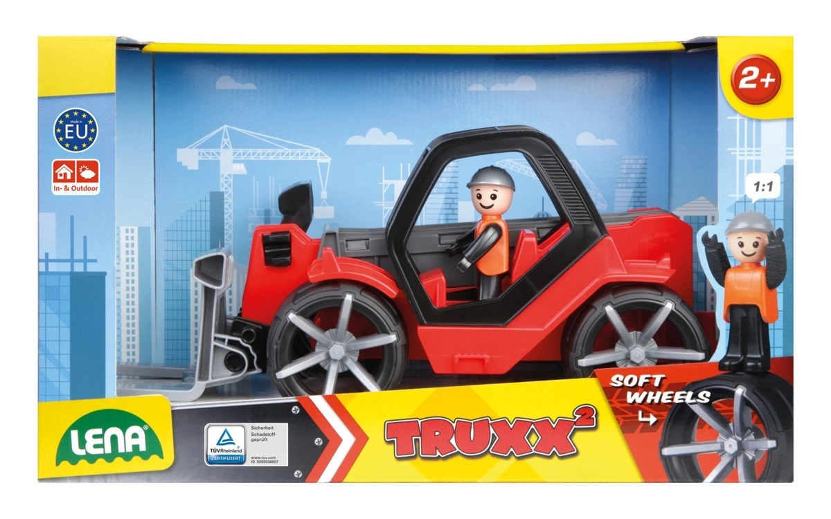 Телескопичен товарач Truxx2 е изработен от висококачествена пластмаса и има много здрава конструкция. Включва също сваляща се кабина с фигурка и гумирани колела за тихо движение.