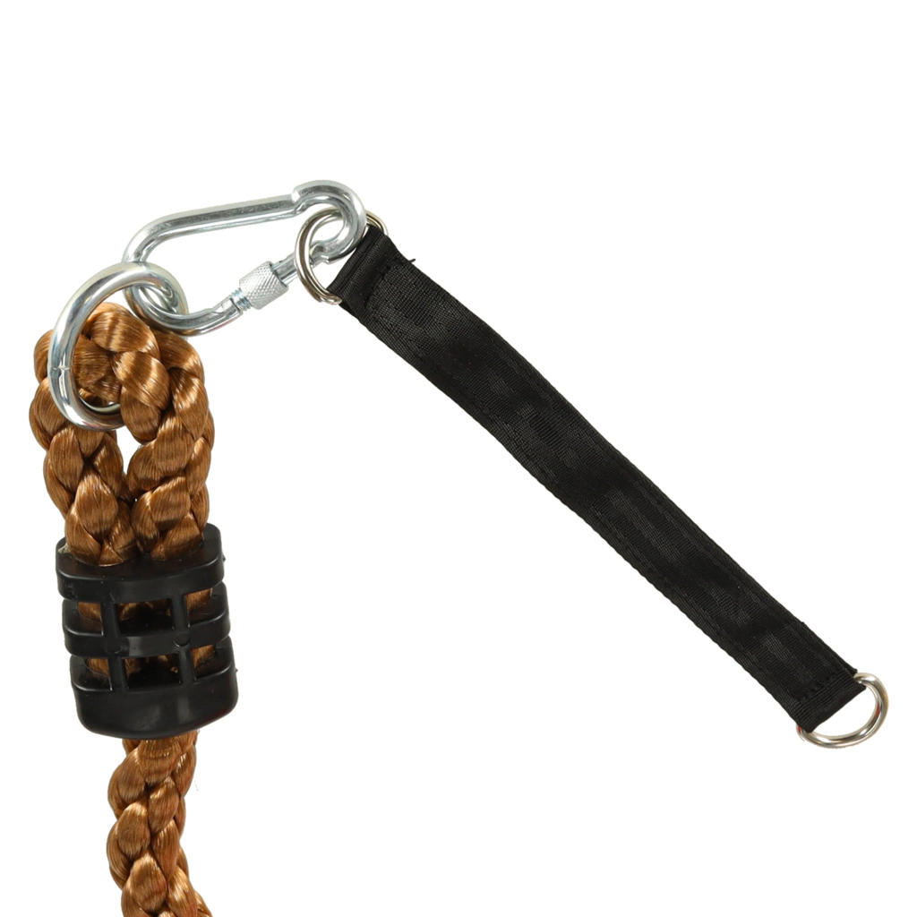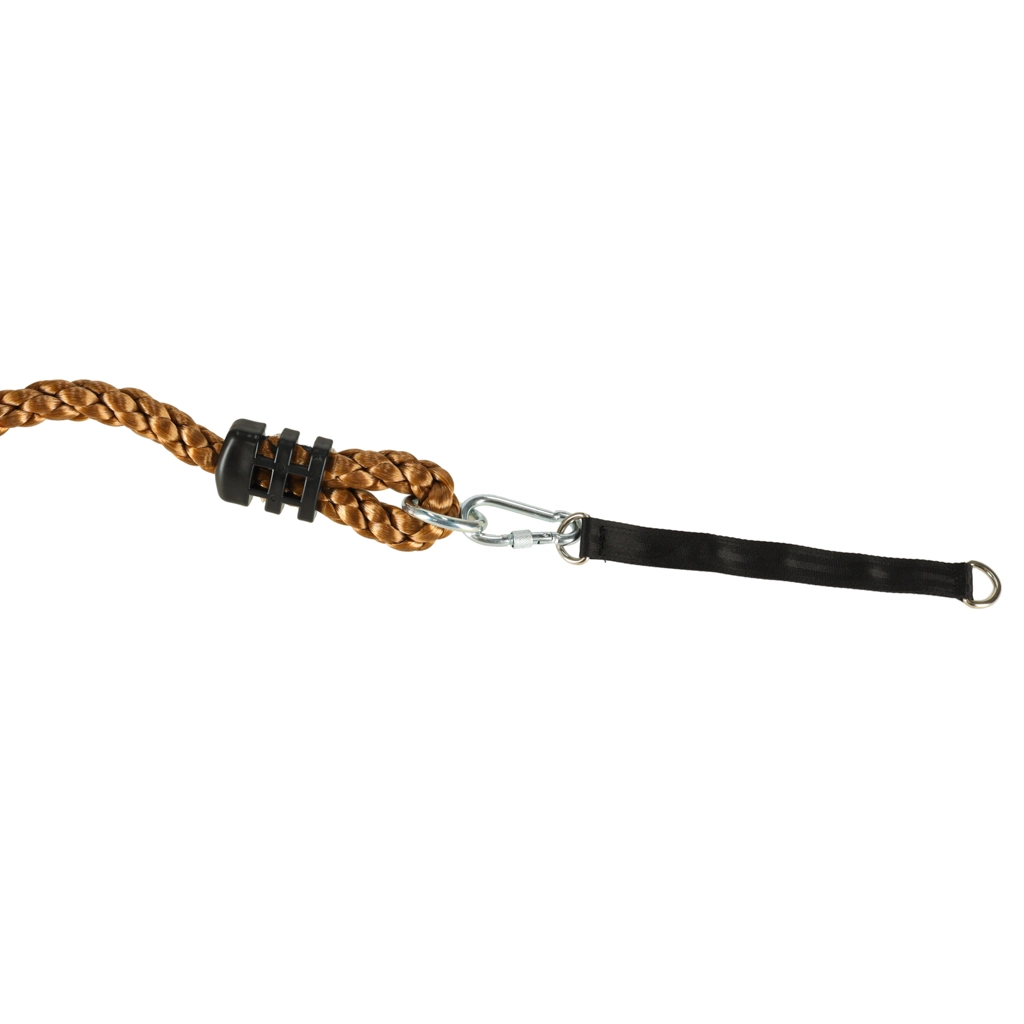 Не е нужно да имате въжен парк, за да подарите приключение на децата. Достатъчно е дърво или градинска конструкция и монтажът на въжето отнема миг. Карабинерът и фиксиращата лента са включени; благодарение на универсалната система въжето може да се закачи навсякъде: на стълба, къщичка, клон или греда.