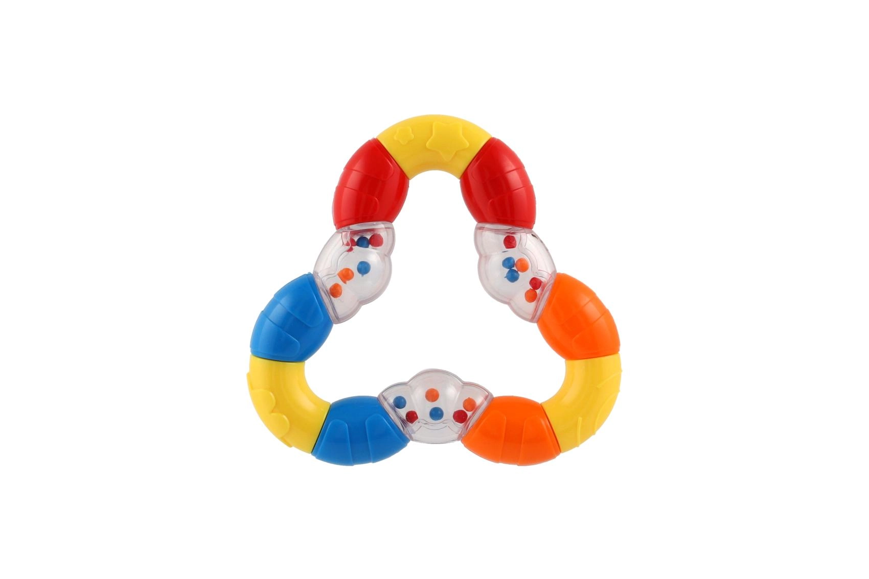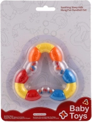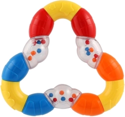 Тази мултифункционална дрънкалка и гризалка с форма на триъгълник е проектирана специално за най-малките деца. Благодарение на гъвкавата пластмаса е лесна за захващане дори от малки ръчички и предлага приятна повърхност за гризане, което помага да се успокоят венците. Нежното дрънкане същевременно подпомага слуховото възприятие и привлича вниманието на детето.