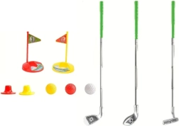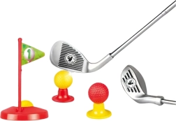 Този детски голф комплект е идеален за различни игри и състезания. Съдържа три различни голф стика, три цветни топки (бяла, червена, жълта), две поставки и две дупки с флагчета. Реалистичният вид и качествената изработка дават на децата усещане, че са истински голфъри. Комплектът е подходящ за деца от 3 години. Може да се използва за игра самостоятелно или с връстници, насърчавайки здравословна състезателност.
