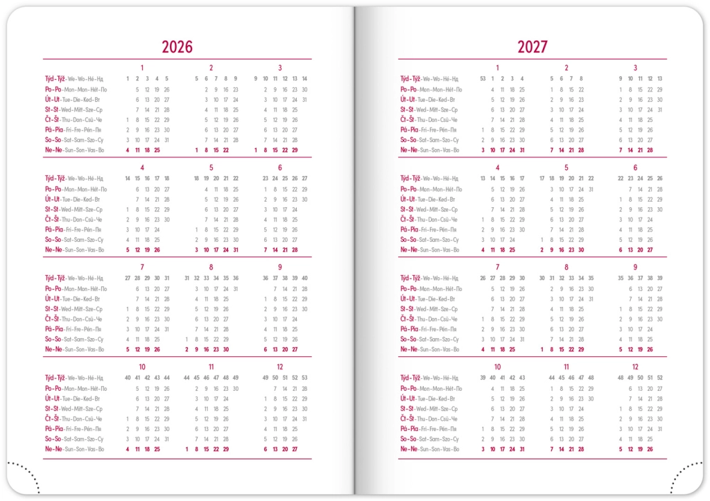 Елегантен седмичен дневник Ajax 2026 в златист цвят с фино текстуриран повърхностен слой и атипичен релеф е идеален спътник за всеки ден. Благодарение на чешко-словашкия календар и допълнителния английски, немски, унгарски и руски език е практичен и приспособим за всеки.