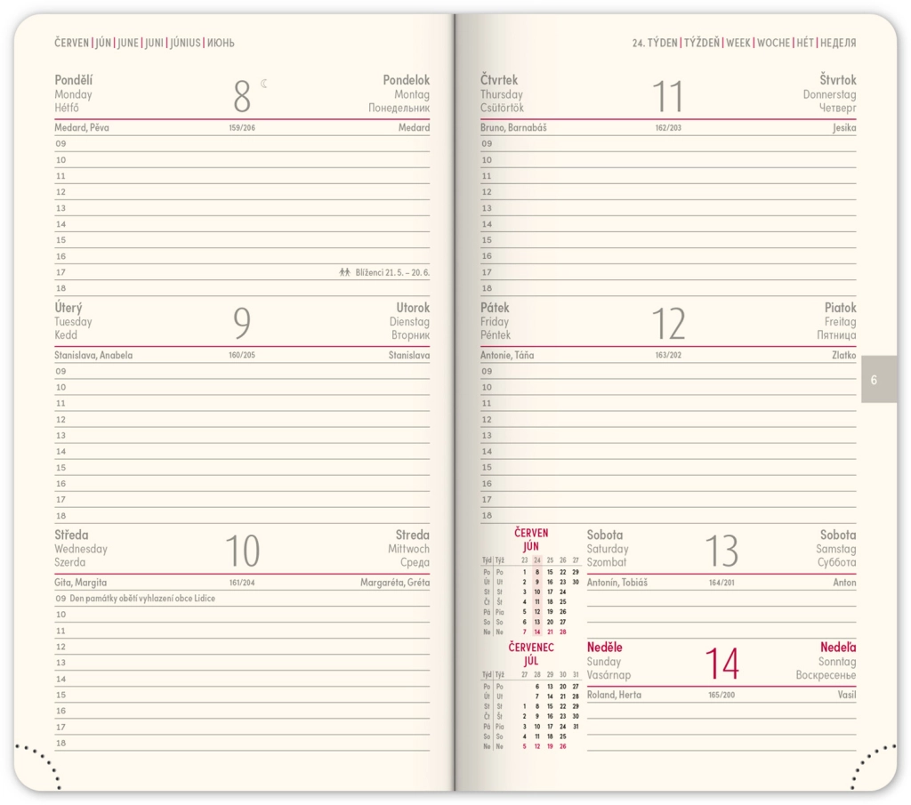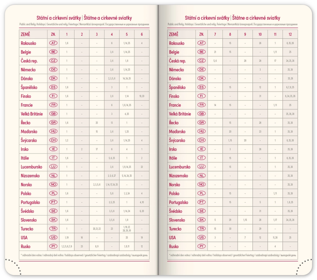 - Седмично разпределение с чешко-словашко календариум и допълнителни езици като английски, немски, унгарски и руски.